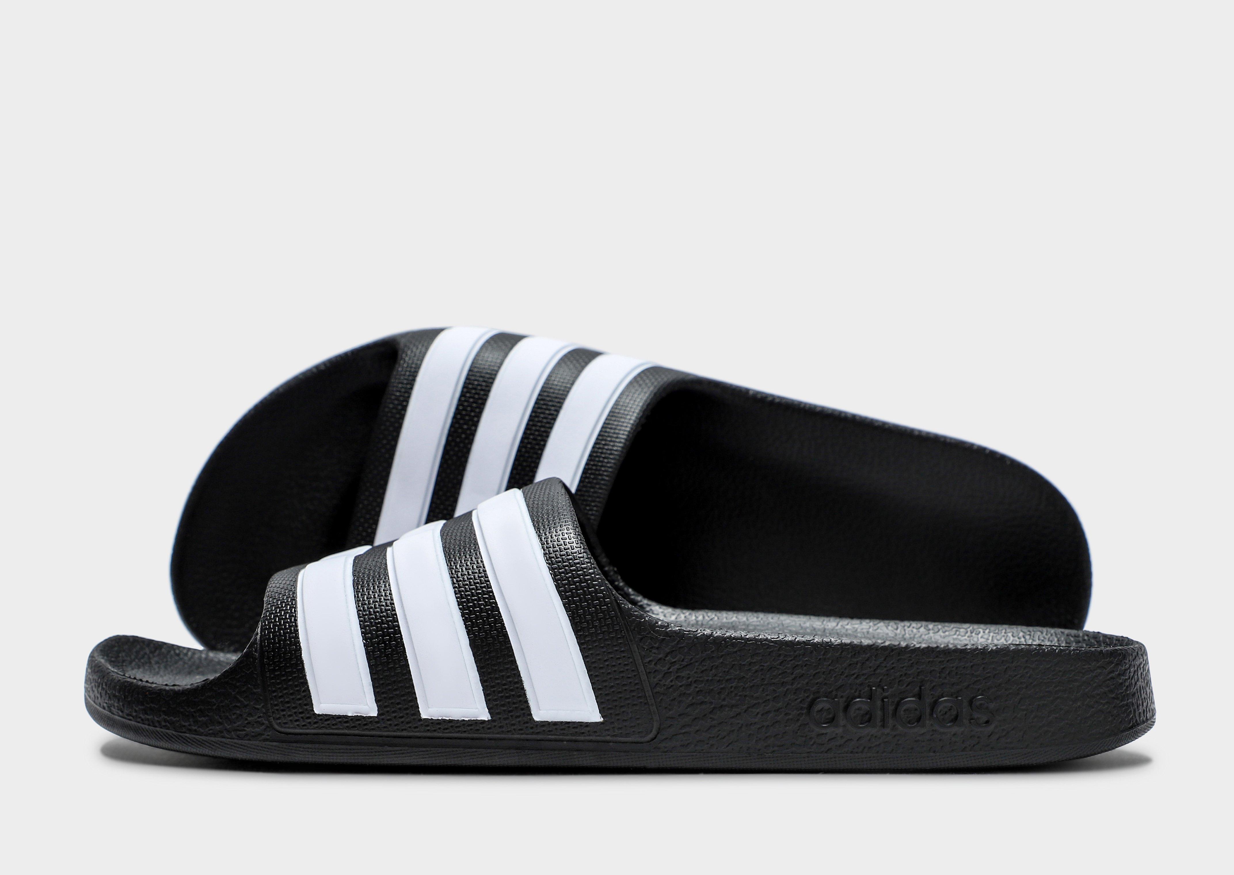 Keep your feet feelin' comfy and chilled out with these juniors' Adilette Aqua Slides from adidas. In a black colourway, these slides are made with a synthetic strap upper for easy access and a secure wear. Sat on a chunky Cloudfoam footbed for next-level cushioning in every step, they're perfect for chillin' at home or on your hols. With a grippy outsole, they are finished with adidas branding to the sides and contrasting white 3-Stripes across the strap.