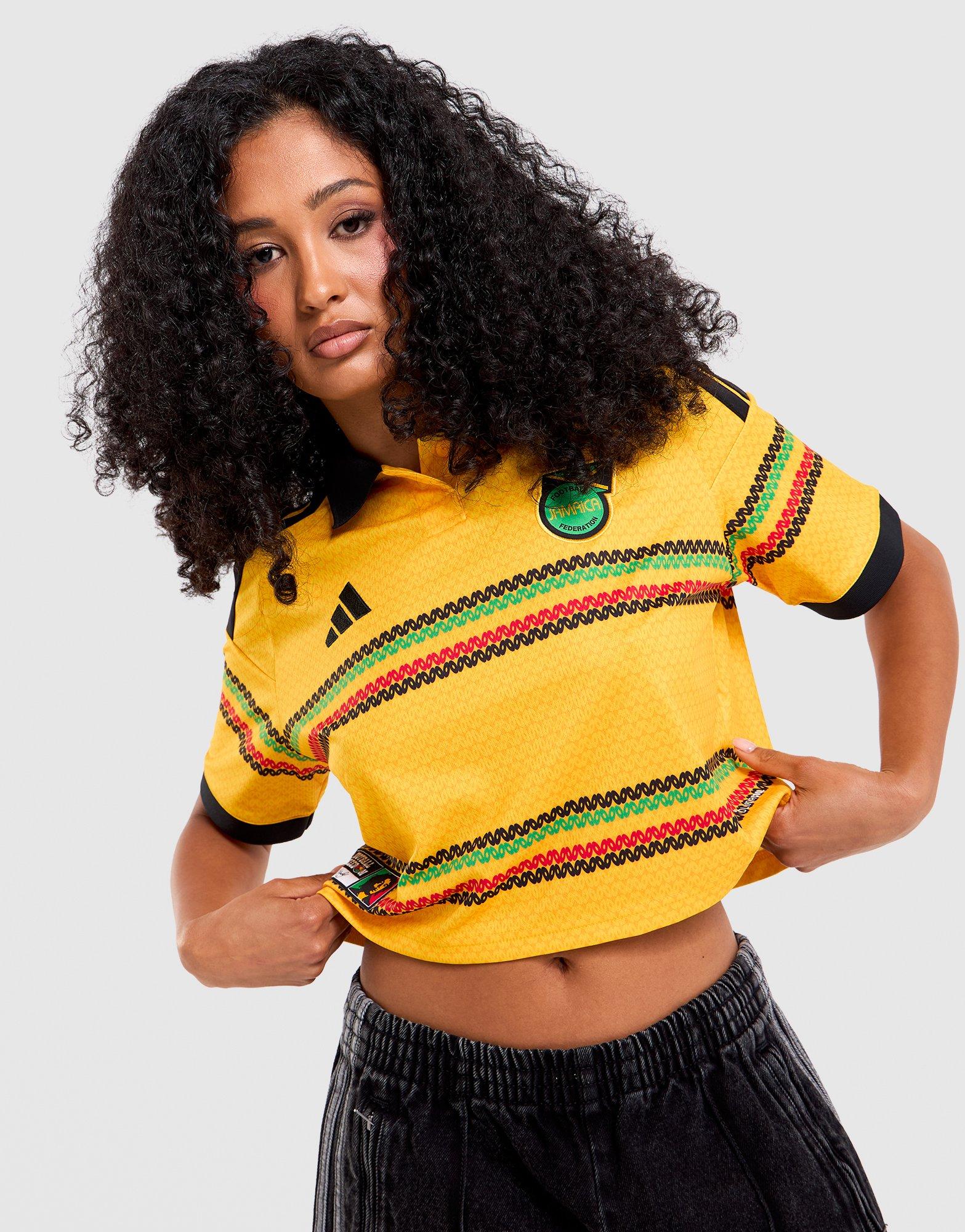 Rep Jamaica with pride in this Women's Adidas Crop Jamaica Home Jersey. Featuring a standard fit and authentic jersey construction, it showcases the iconic black and green colourway for bold national team style. The cropped design adds a contemporary streetwear edge to traditional football apparel. Perfect for match days, casual wear, or showing support for the Reggae Boyz, this jersey brings authentic sport style to your wardrobe. Style Code: KE5241