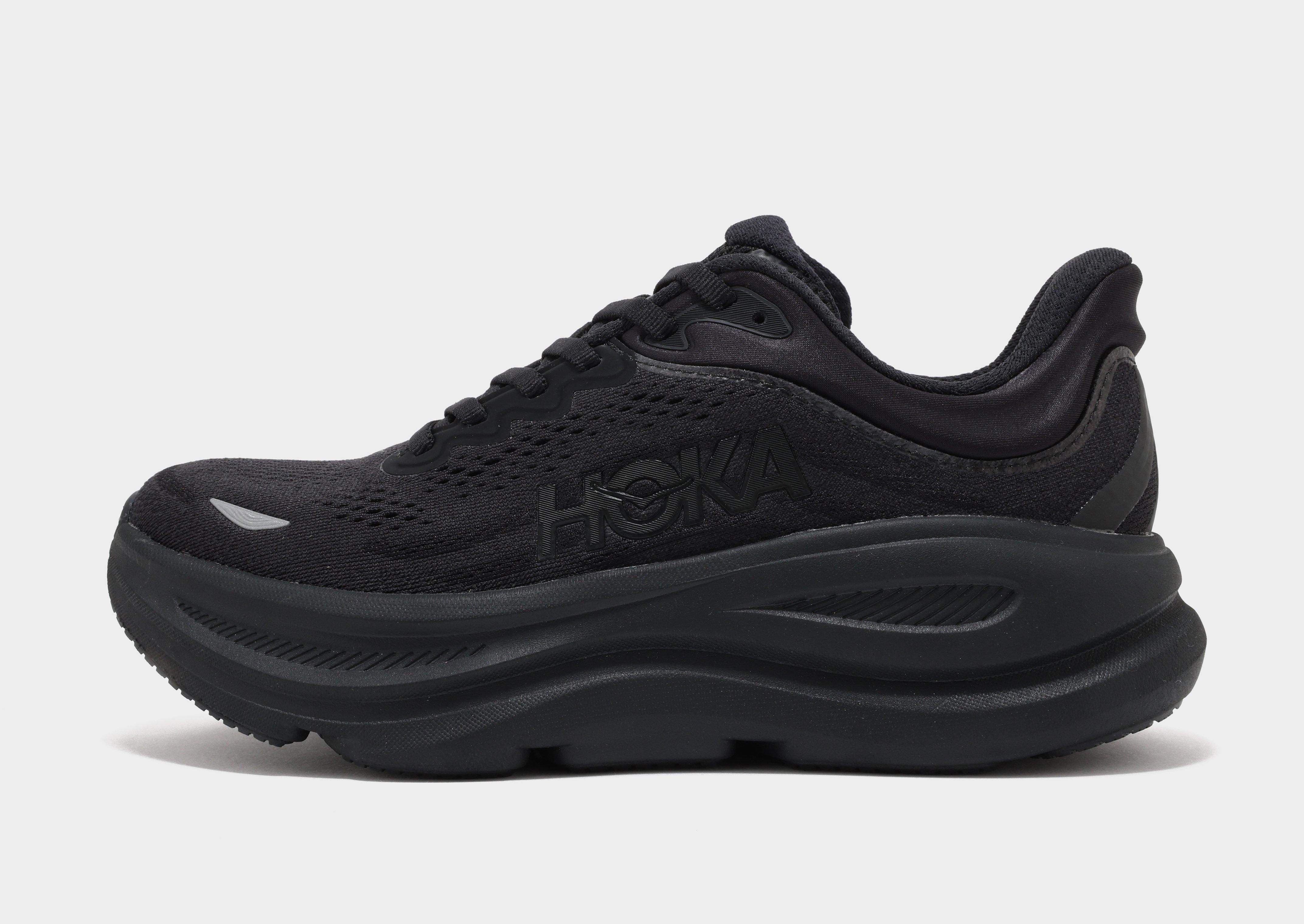 Make every mile count with these women's Bondi 9 running shoes from Hoka. In a Black colourway with tonal details, these runners are cut from light, breathable mesh in the upper that includes 50% recycled polyester. They feature a lace fastening to lock you in, with a padded collar for added support and an Ortholite sockliner for a snug fit. Underfoot, they sit on a chunky foam midsole for a smooth ride, with a grippy rubber outsole for traction. With heel tabs for easy on-and-off, they're finished up with classic Hoka branding. Style Code: 1162012-BBLC