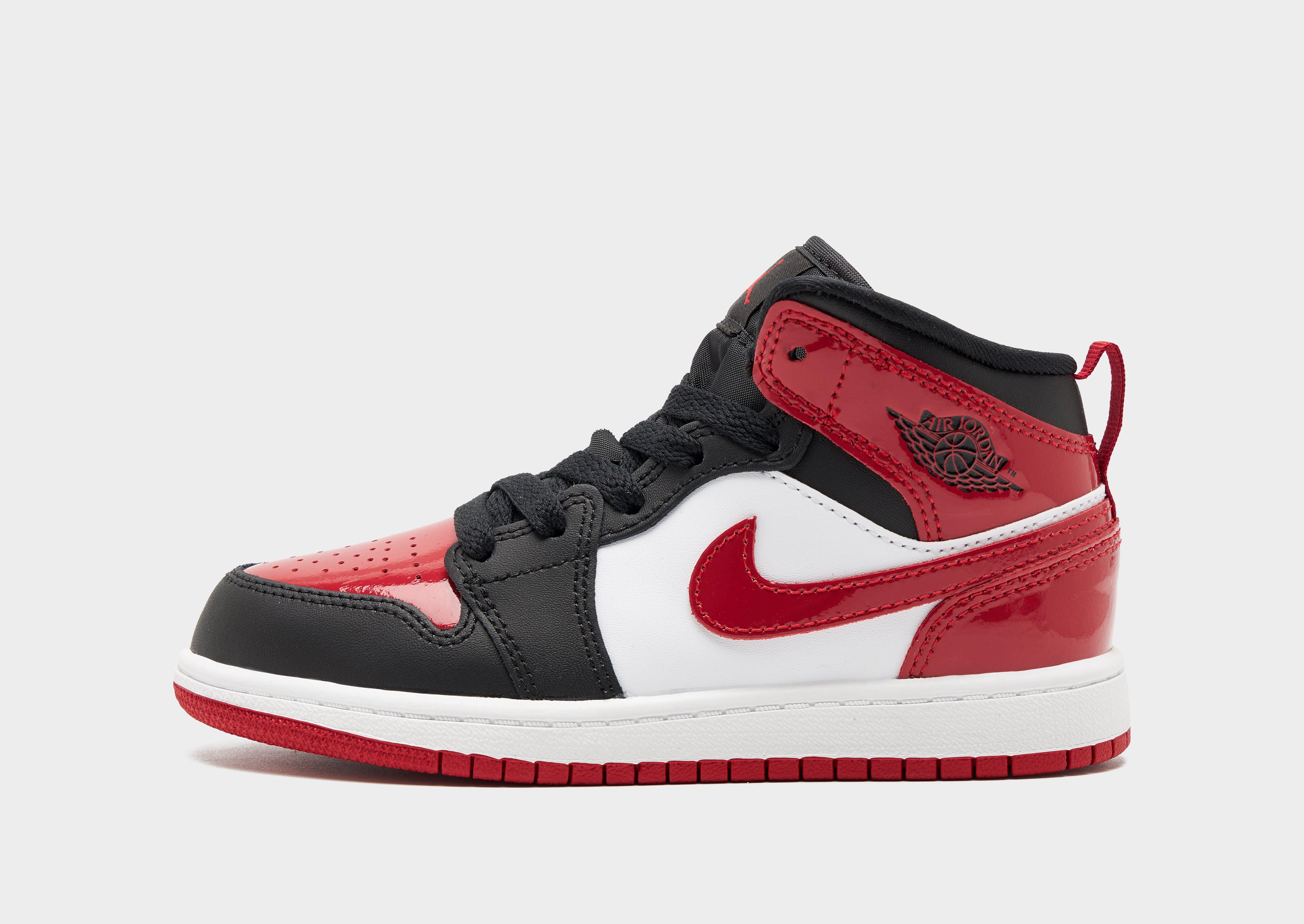 Keep your rotation iconic with the epitome of sneaker culture: the Air Jordan 1 Mid. Born from the collaboration between Nike and basketball legend Michael Jordan in 1985, the AJ1 changed the game forever, shattering conventions with bold colours and silhouettes. In a Black colourway with Red details, these mid-top shoes are crafted from a leather, patent leather and textile blend across the upper for support. Underfoot, the foam midsole combines with Nike Air cushioning for lightweight comfort, while the durable rubber outsole has pivot circles for retro-inspired traction. With a padded ankle collar and perforations on the toe, these kicks are finished off with the Swoosh and Air Wings logo to the sidewalls and the iconic Jumpman to the tongue. Decades later, the AJ1 remains an icon of style and athleticism, transcending generations with its timeless design and legendary status. Style Code: HV4444-006