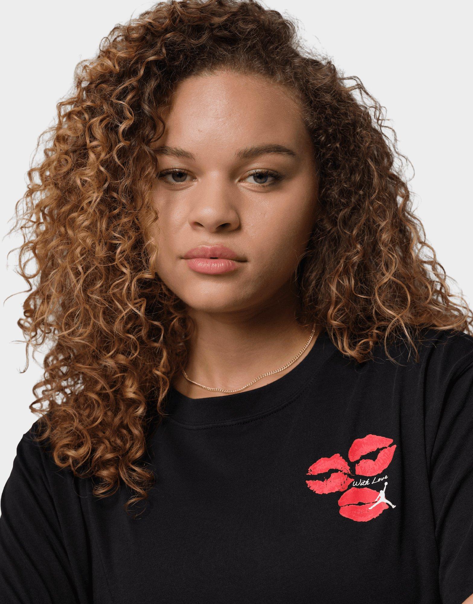 Bring bold Jordan style to your rotation with this women's Jordan Kiss Graphic T-Shirt. Featuring a standard fit and short sleeves, it showcases striking graphic detailing on a black base with red accents. The eye-catching design celebrates iconic Jordan heritage while keeping comfort front and centre. Perfect for pairing with jeans, joggers, or skirts, this tee adds basketball-inspired edge to casual looks. Style Code: IF0797-010