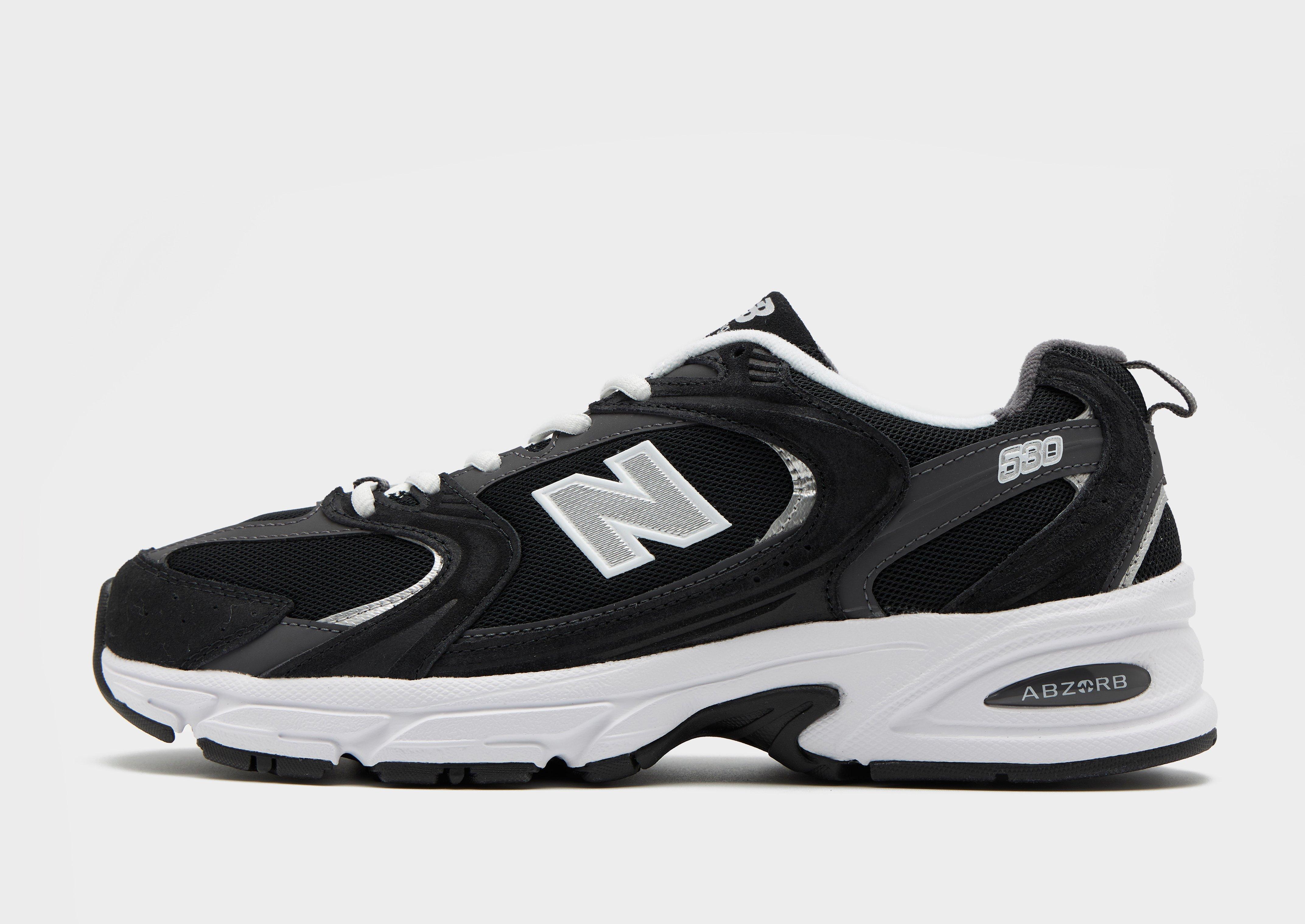 Level up your off-duty rotation with these men's 530 trainers from New Balance. Bringin' an old-school running silhouette to your game, these lightweight sneaks have a Black upper that features a smooth textile and overlaid suede panels. With a tonal lace-up fastening and plush ankle collar for step-in comfort, they're sat on a flared midsole for everyday cushioning. With a bold rubber outsole that runs up the heel, these kicks are finished off with an oversized 'N' logo to the sidewall and New Balance branding to the tongue.