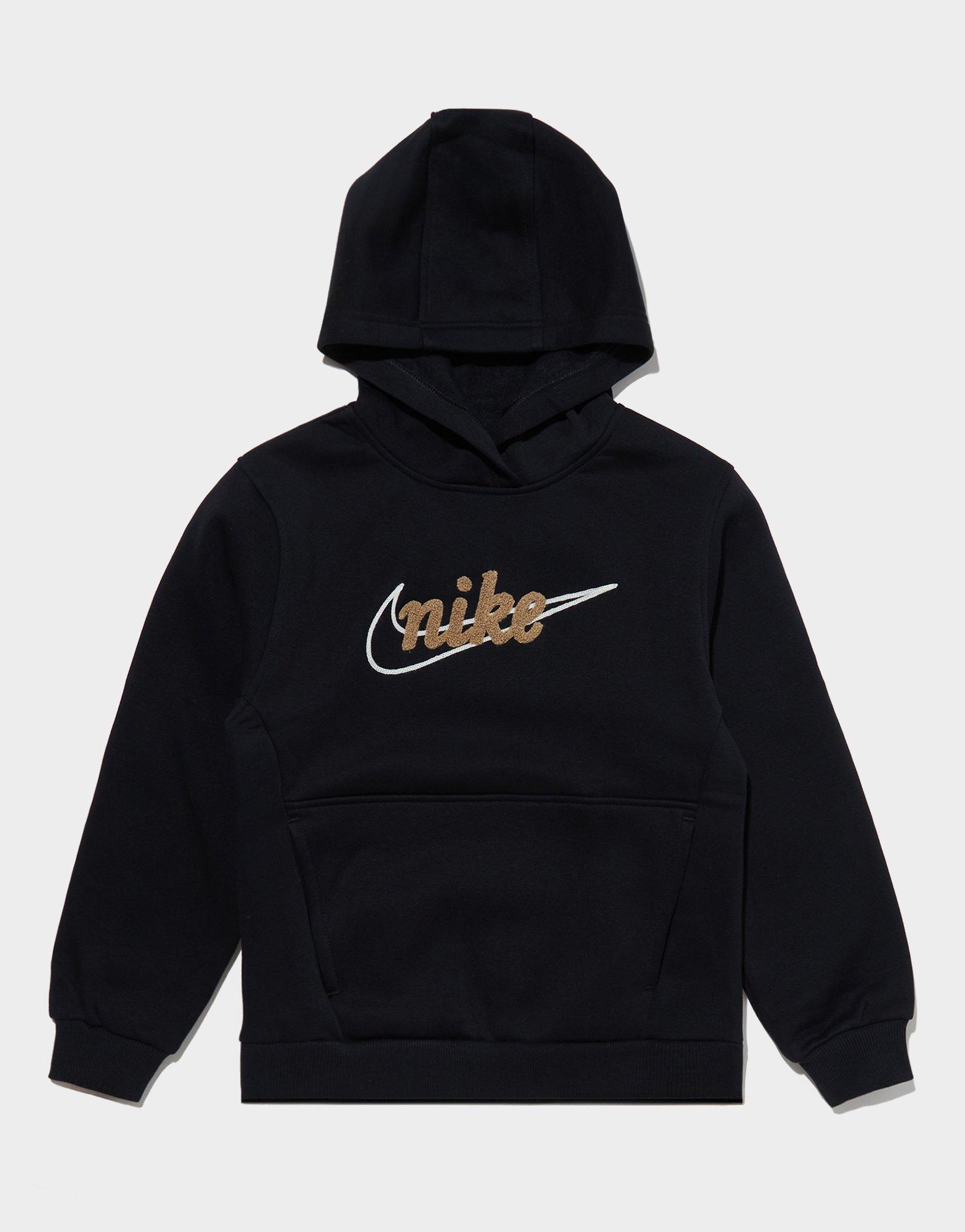 A reliable everyday layer that kids will actually want to wear - the junior's Nike Club Hoodie in black and tan is exactly that. Made from a soft 80% cotton and 20% polyester brushed-back fleece blend, it delivers cosy warmth with the kind of durability you need from a kids' staple. The black colourway with tan details gives it a cool, streetwear-influenced edge that sets it apart from the typical junior hooded fleece. A crossover hood design, kangaroo front pocket and ribbed cuffs and hem keep the practical details locked in. Style Code: IF2291-010