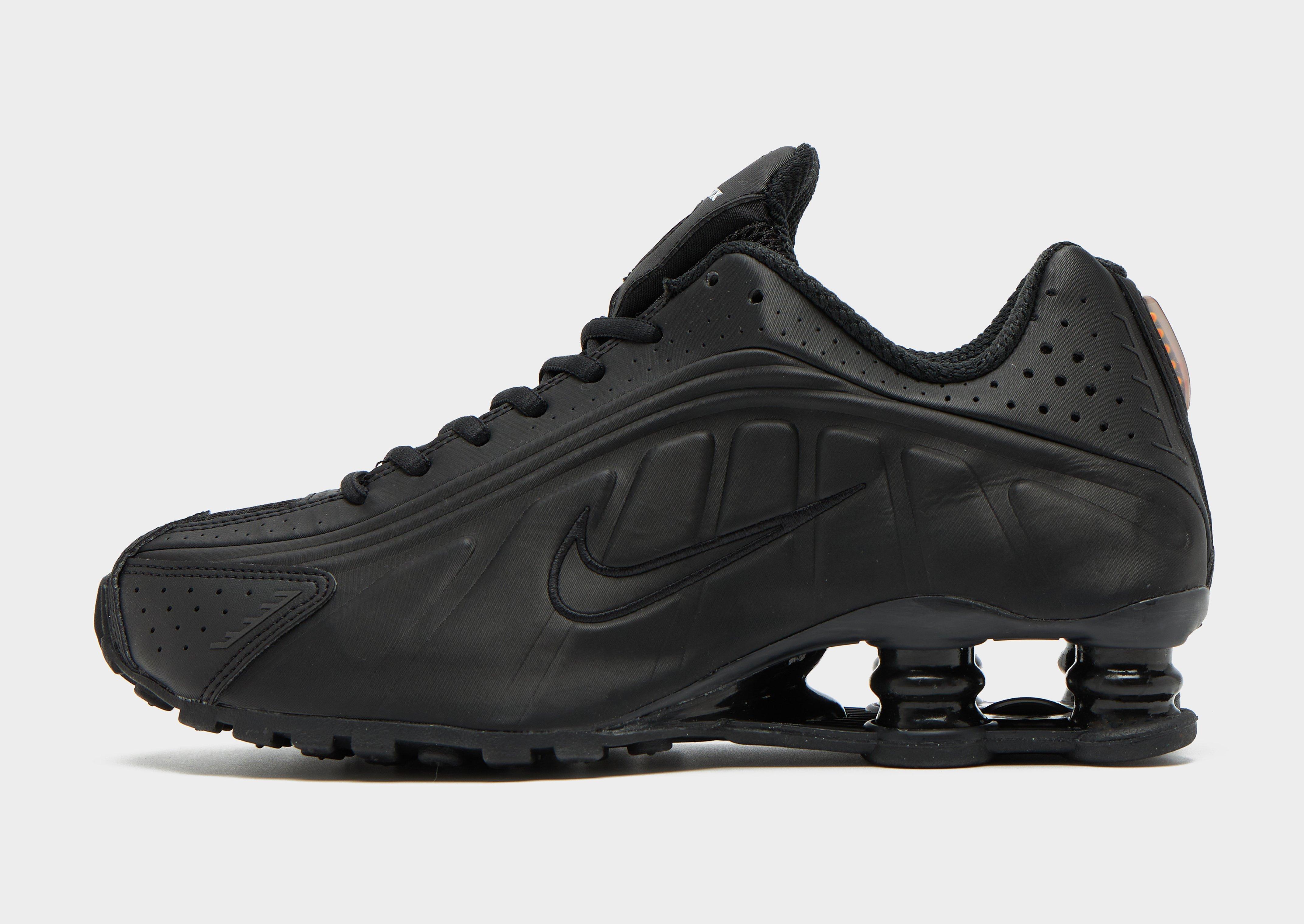 Retro but futuristic, these women's Shox R4 shoes from Nike bring back the 2001 icon in its OG form. In a blacked-out colourway, these statement sneakers are built with a breathable mesh upper that features matte TPU overlays and a tonal lace up fastening for a locked-in fit. Nike's iconic Shox tech sits underfoot, with a full-length midsole of springy Shox columns for a super comfy feel. With a grippy rubber sole, these trainers are finished with Shox branding to the tongue and the signature Swoosh logo embroidered to the sidewalls.