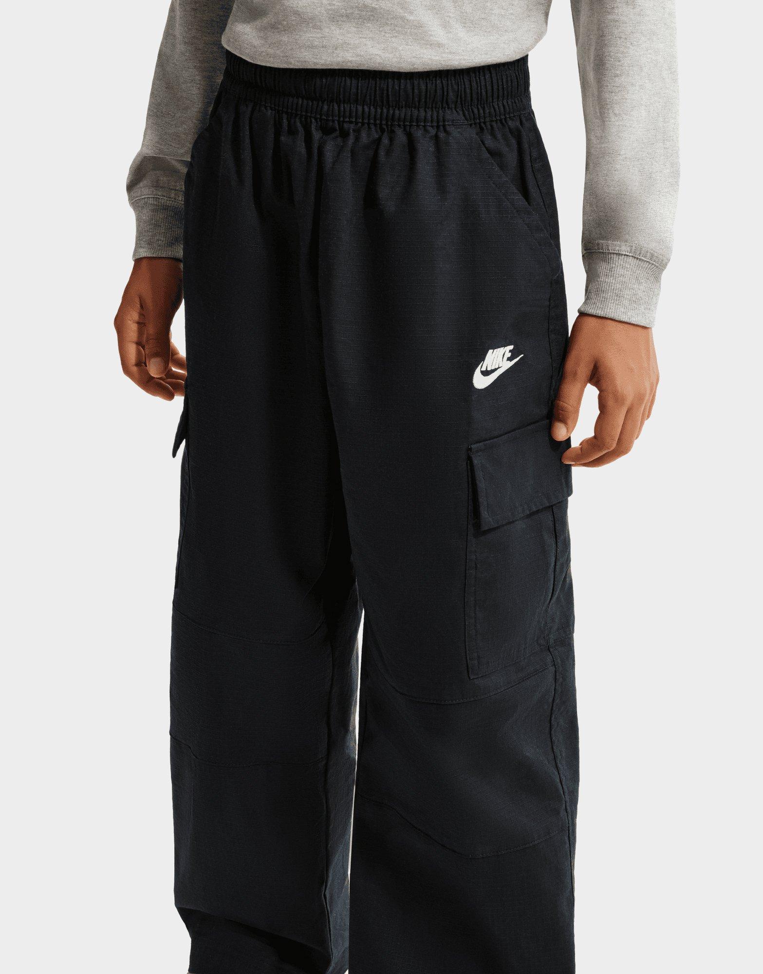 The Nike Club Woven Cargo Pants in junior sizing bring a sport-meets-street aesthetic into kids' wardrobes with a practical, comfortable build that's built for active days. Made from a woven ripstop fabric with a touch of stretch - 97% cotton and 3% spandex for the body - the relaxed fit through the seat and thighs pairs with deep cargo pockets and a drawcord waist for an easy, everyday feel. The black colourway with white detailing keeps it versatile for styling with any top in the rotation, and the embroidered Nike Futura logo adds the brand signature without overloading the clean design. A practical, well-made option in junior Nike sportswear.