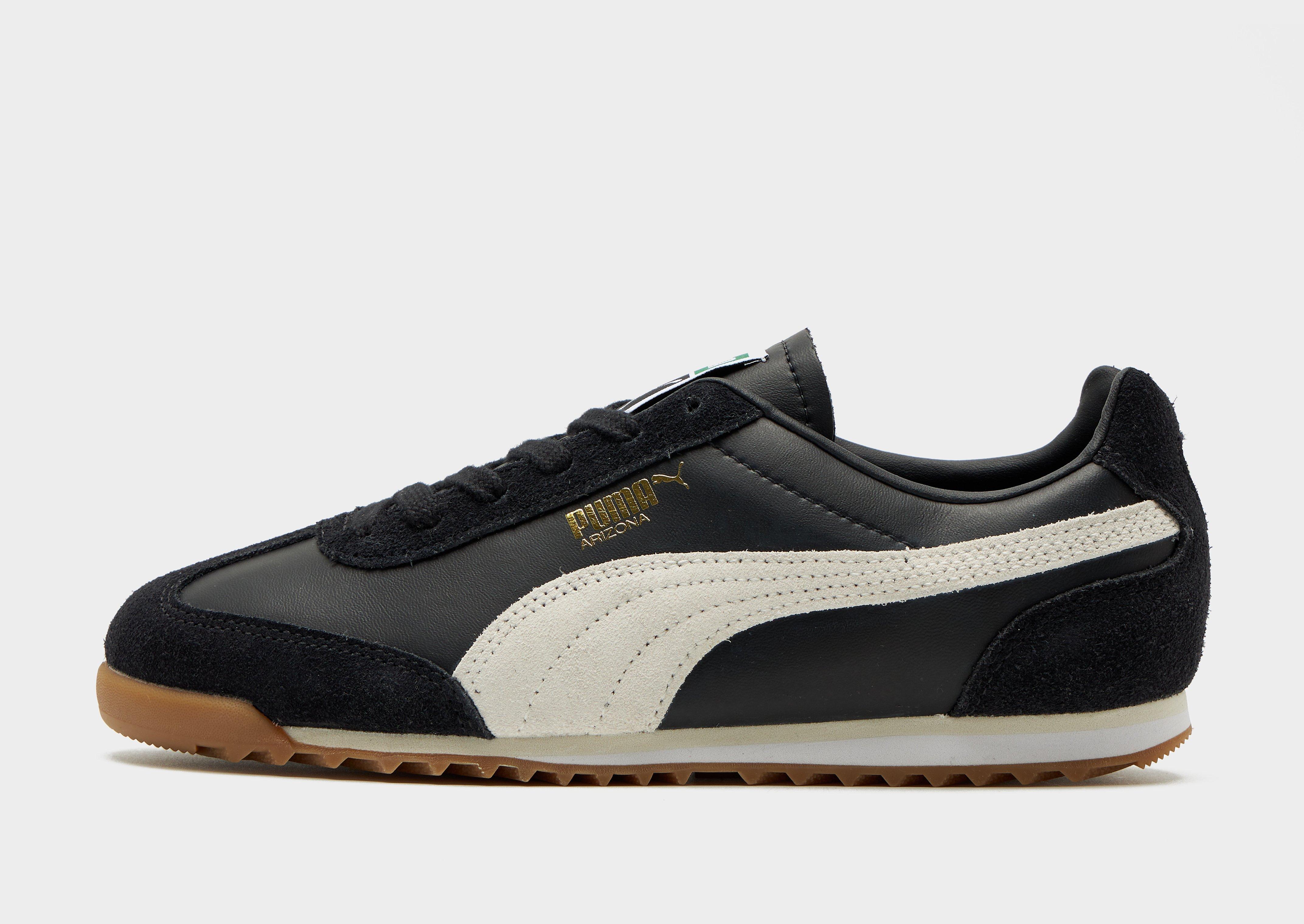Step out from the Formstrip archive with these women's Arizona sneakers from PUMA. In a Black colourway with White accents, these '70s-inspired trainers have a lightweight nylon base with cow leather suede overlays for a classic look and support. They feature a low-profile EVA midsole for cushioning and a rubber tread outsole for essential grip. Finished off with foil printed PUMA Cat branding and the Arizona tab to the side. Style Code: 40235301W