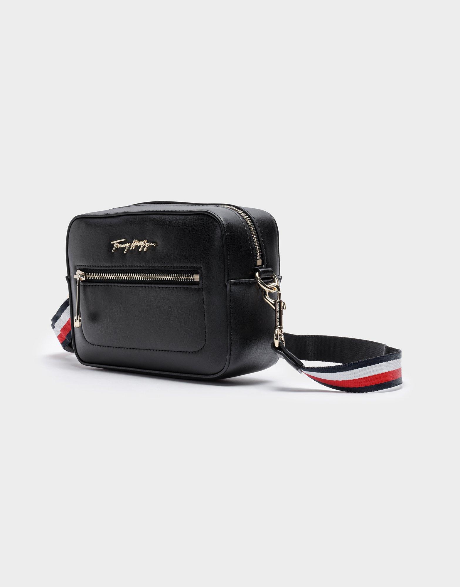 Carry the essentials in premium style with the Iconic Camera Bag from Tommy Hilfiger. Landing in a sleek black colourway, a chunky strap in vibrant signature colours and embroidered branding adds a striking finish to this bag. Features a detachable strap, flap snap tab opening and zip for extra security, as well as two interior compartments for your personal needs.