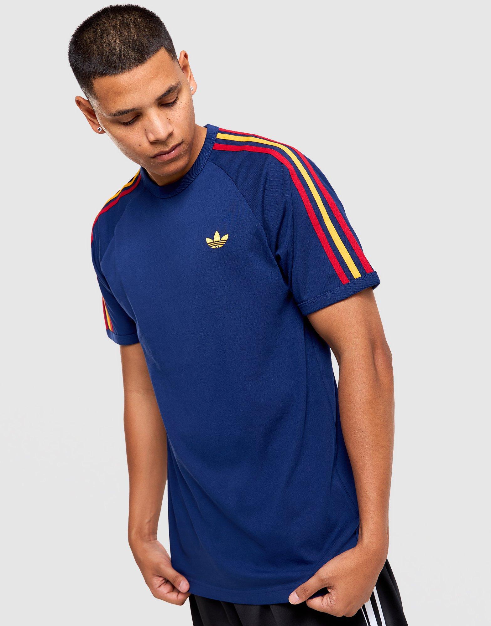 Wear your football allegiance with pride in this men's adidas Spain 3-Stripes Football T-Shirt in Navy with Red and Yellow. Made from lightweight jersey fabric with the signature adidas 3-Stripes on the shoulders and the Royal Spanish Football Federation crest, it delivers La Roja's proud national identity in an easy, wearable everyday format. The Navy base with Red and Yellow details captures Spain's iconic national palette, making it one for the fans who follow their football closely. Style Code: KC8642