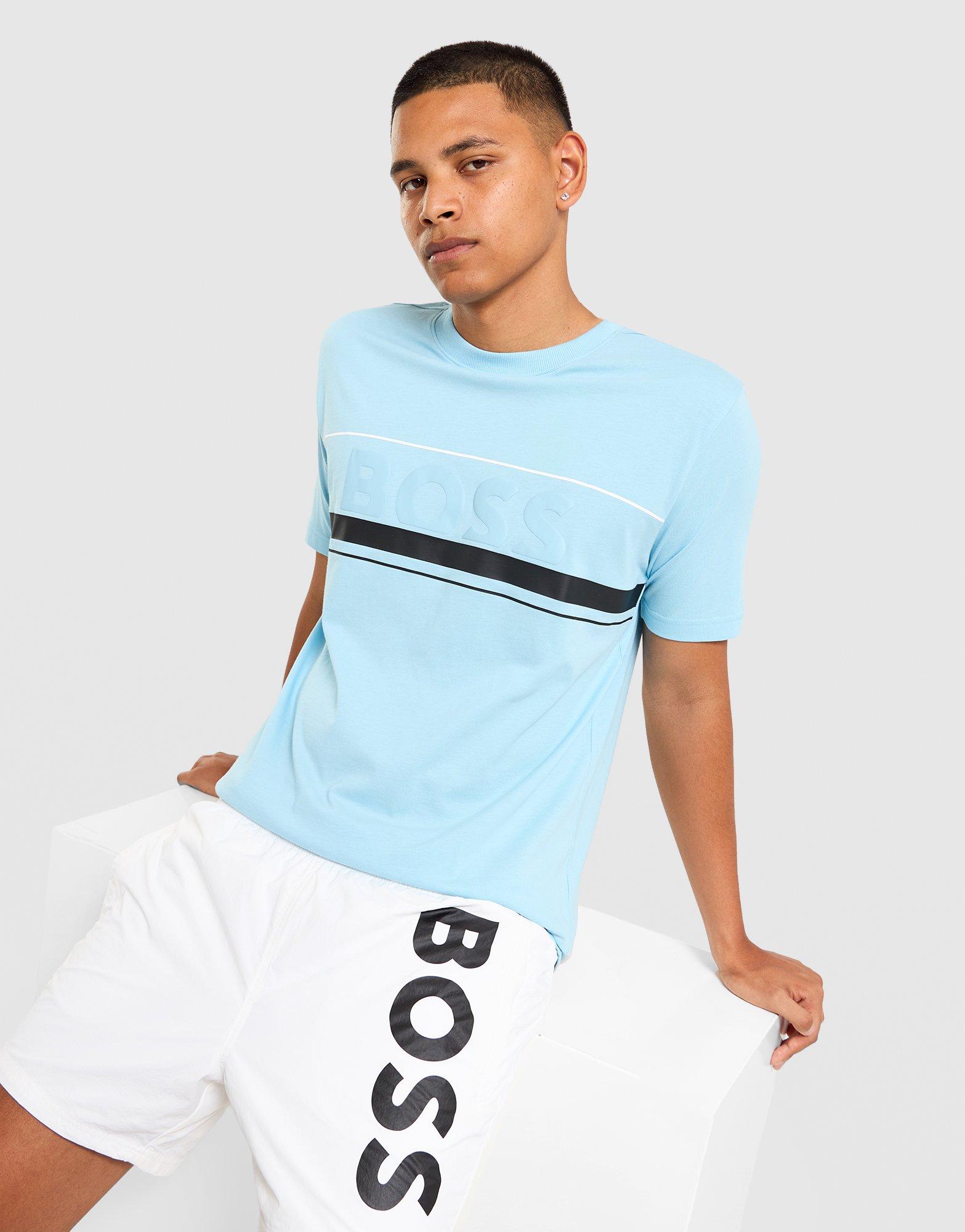 Refresh your tee rotation with this men's Boss shirt showcasing embossed stripe details for elevated texture. Standard fit offers classic comfort while short sleeves keep things relaxed and breathable. Light blue colourway with navy accents adds a fresh, seasonal vibe to your everyday wardrobe. Crafted from soft, durable cotton for all-day wearability. Premium sportswear styling from Boss that never goes out of fashion.