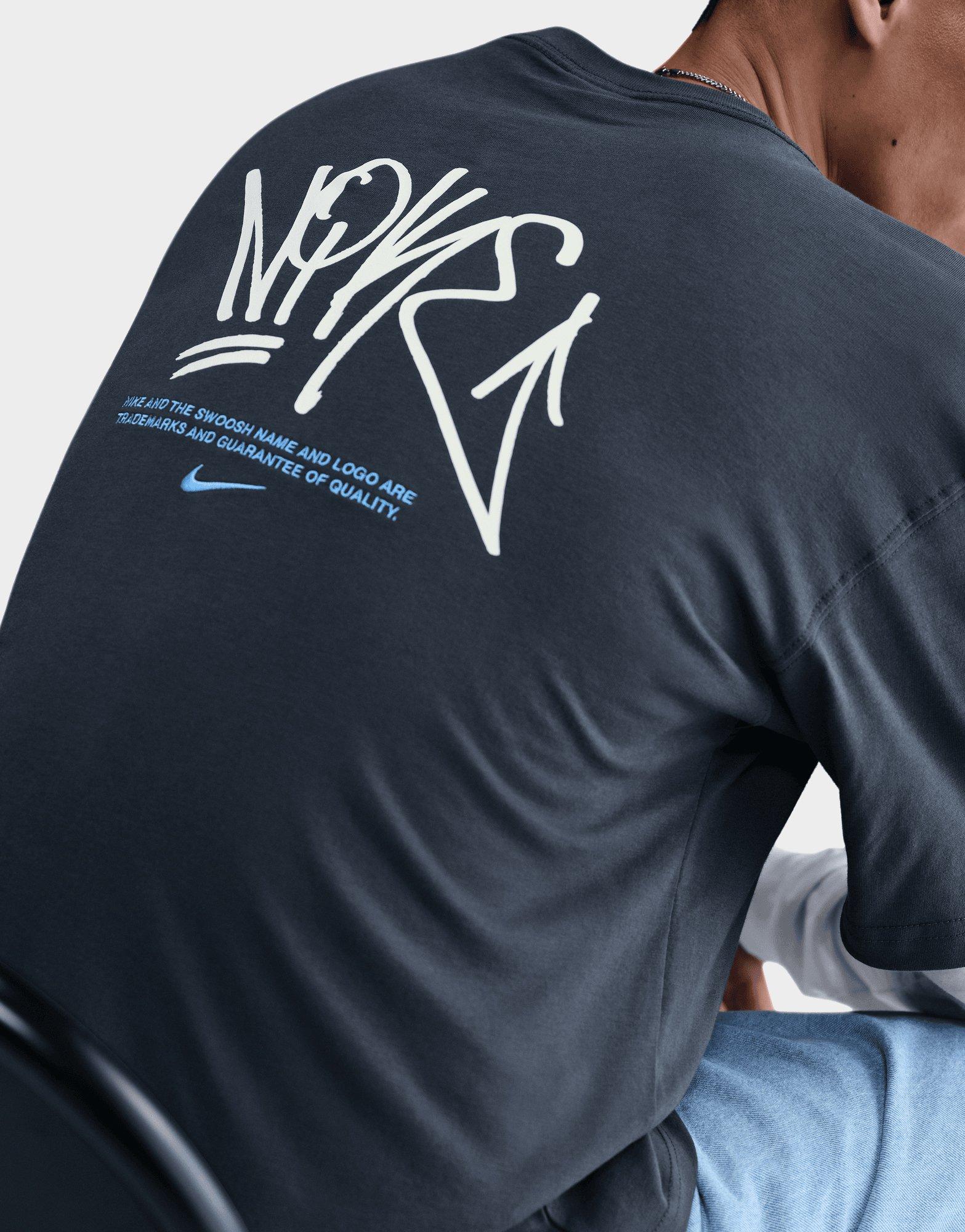 Upgrade your streetwear rotation with this men's Nike Street Graphic T-Shirt, exclusive to JD for standout style. Featuring a standard fit with short sleeves, it showcases front and back logo graphics on a navy base with light grey detailing. Made from comfortable cotton fabric, this tee offers all-day wearability for casual outings or layering under jackets. A bold addition to any Nike collection.