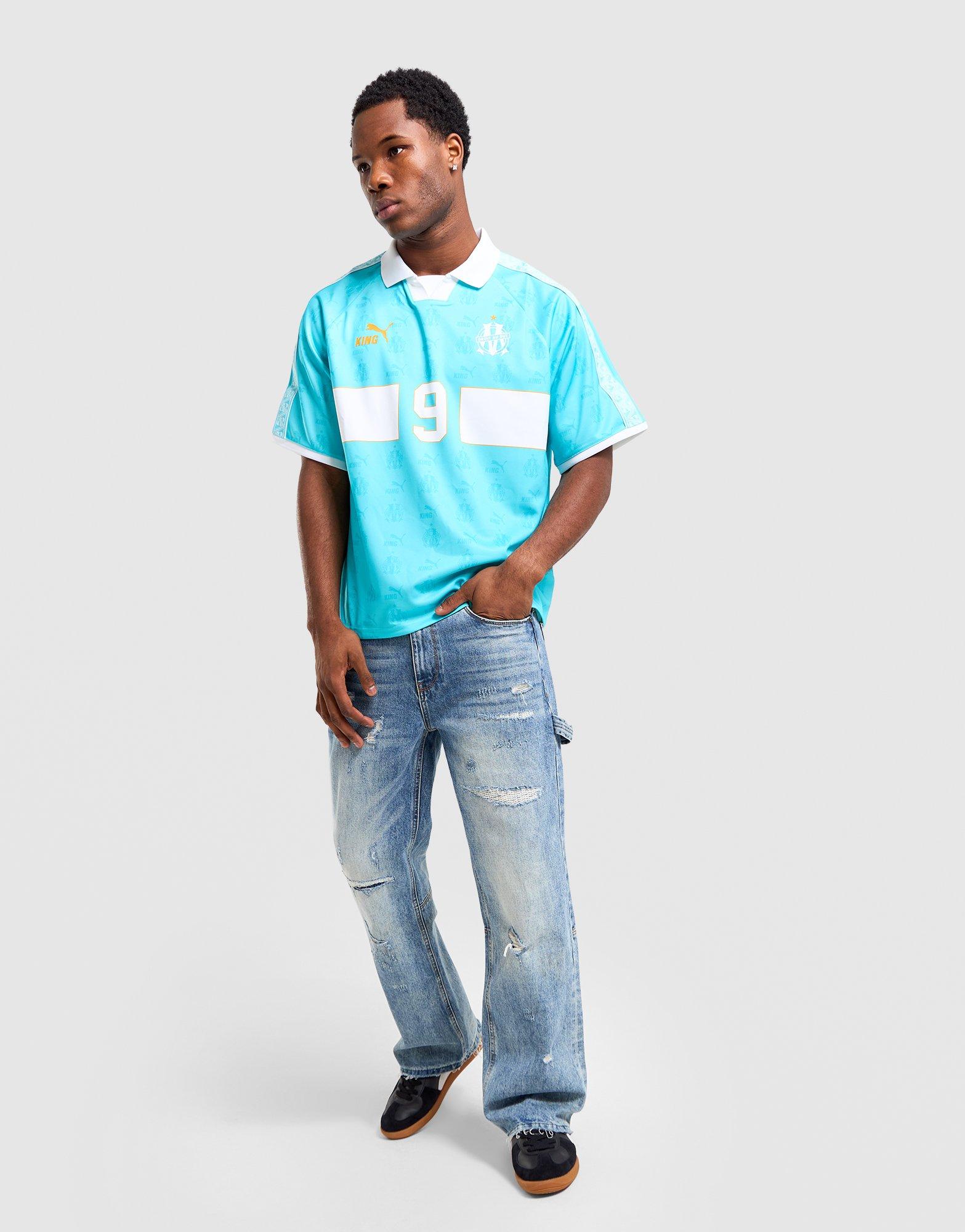 The KING relaunch is here, crafted for Olympique de Marseille supporters - a leisurewear piece that celebrates the legacy of the KING line, blending team pride with an archive-inspired aesthetic and paying tribute to true royalty on and off the pitch. The teal colourway features a striking Team Aqua base with a stark white horizontal band across the chest, a matching white polo collar and sleeve cuffs, and a large block number nine outlined in gold on the front and back. Look closely and you will notice a subtle all-over jacquard embossed pattern woven into the fabric repeating the vintage OM badge and the Puma King logo, alongside old-school geometric pattern taping running down the sleeves for that authentic 90s aesthetic. A men's Puma x Olympique de Marseille retro jersey that is as much a collector's piece as it is a wearable football lifestyle staple. Model is 189cm with 99cm/39” chest and wears size Large.
