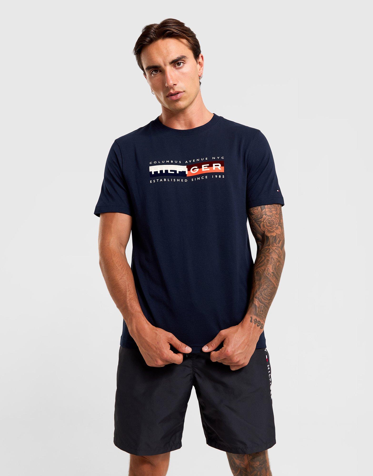 This men’s Tommy Hilfiger Quad Box Flock T‑Shirt in navy features bold graphic branding. Made from cotton-blend, it offers a standard fit that’s comfortable and casual. Ideal for layering or standalone wear with jeans and shorts.