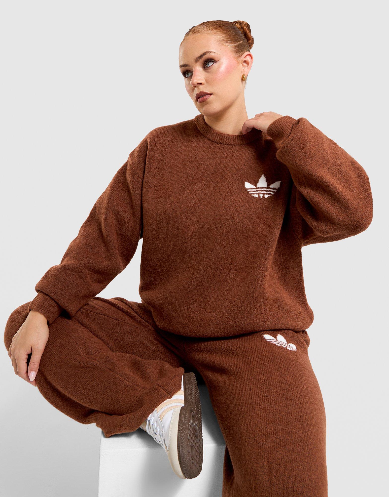 The women's adidas Originals Oversized Knit Heritage Transfer Crew Sweatshirt in Brown with White is the warm-tonal top that pairs perfectly with the matching loose straight jogger to complete the Heritage Transfer co-ord. Made from a knit fabric blend with a relaxed, oversized crew neck silhouette, it delivers the soft, structured finish that defines this season's adidas Originals women's knitwear range. The Brown with White palette channels an earthy, vintage-sport aesthetic that feels both nostalgic and completely fresh for the season. Style Code: KF2340