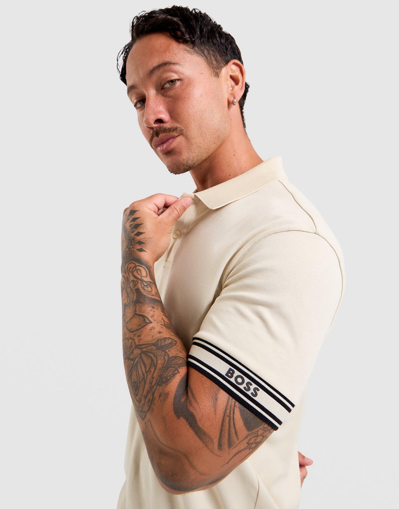 The BOSS Jacquard Sleeve Zone Polo brings a premium material story to the men's polo shirt format - a piece that sits comfortably in the space between smart and casual. The jacquard-woven sleeve detailing adds tactile texture and visual interest to a stone base, with black zone graphic accents giving the design a structured, considered feel. Made from a quality cotton-blend fabric with a regular fit, this men's BOSS polo works well with chinos, tailored shorts or even relaxed denim, making it one of the more versatile pieces in the range.
