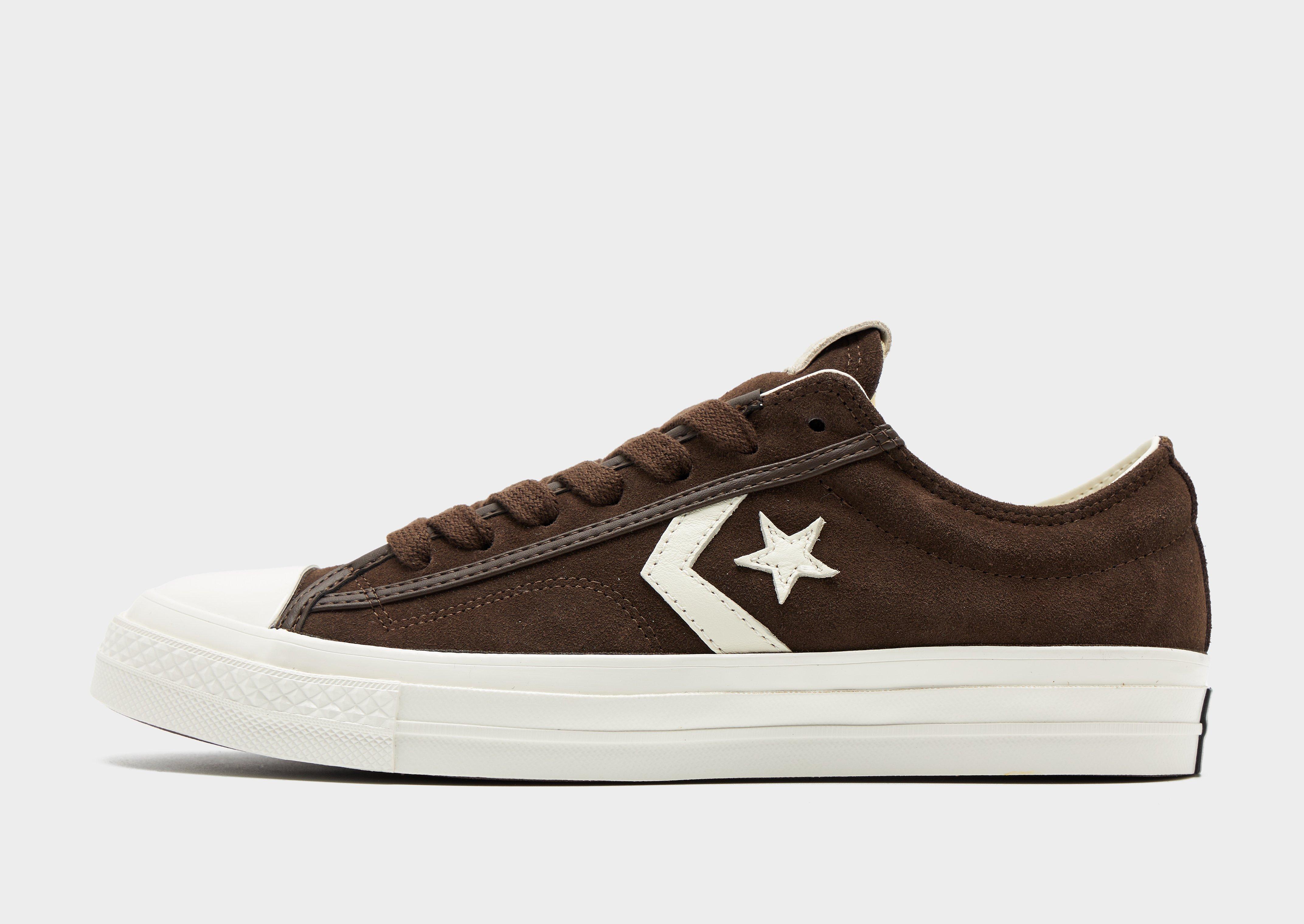 Rep an old-school look from Converse with these men's Star Player '76 shoes. In a Brown colourway with Off-White details, these low-top sneakers have a classic canvas upper with a durable toecap for a signature look. With a tonal lace-up closure and padded ankle collar, they're sat on a striped midsole for lightweight, all-day cushioning. Featuring a grippy rubber outsole, these kicks are finished up with contrasting Star and Chevron branding to the sidewalls as well as 'Star Player' tab to the tongue. Style Code: A13608