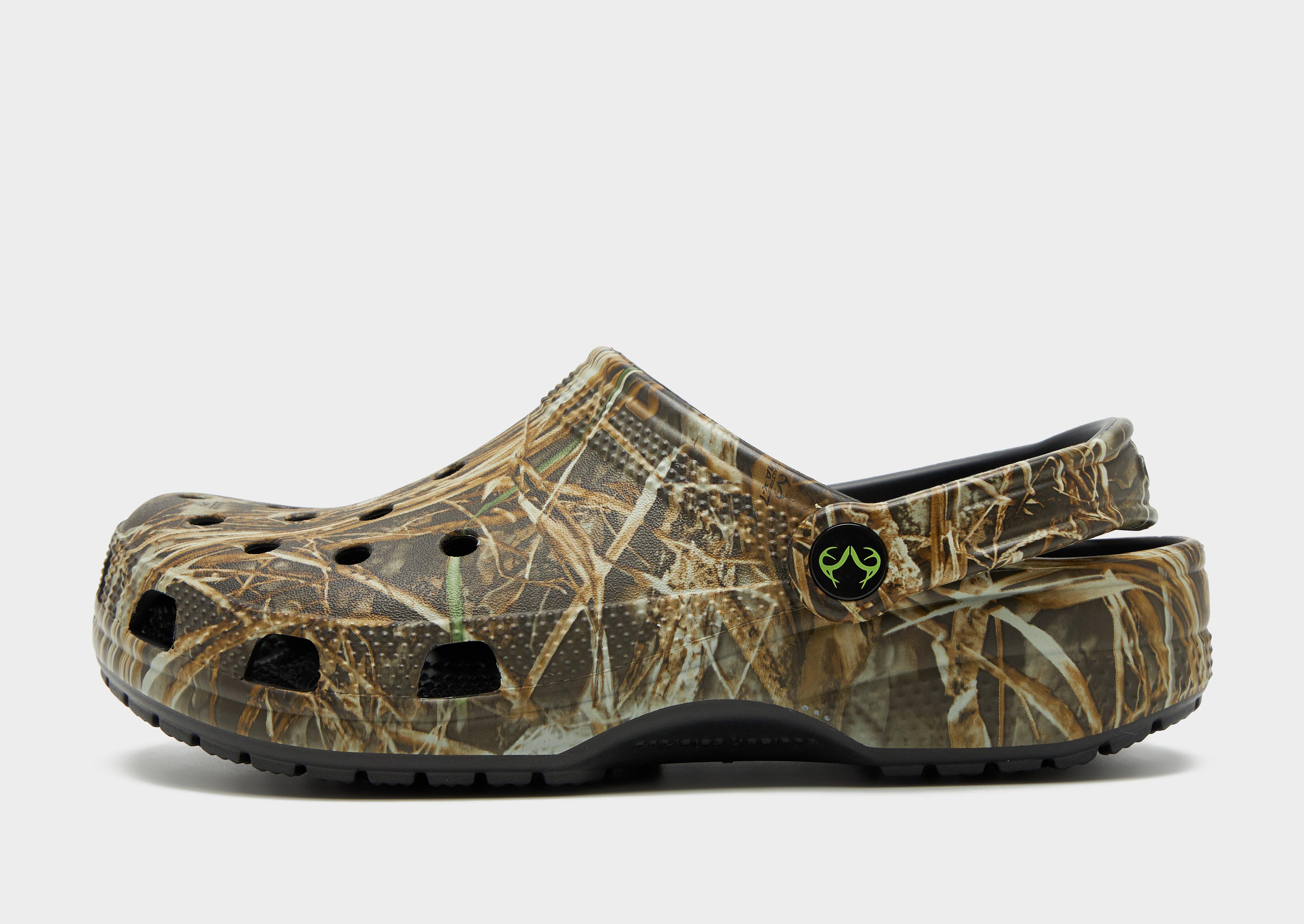 The women's Crocs Camouflage Classic Clog in Khaki is the outdoors-inspired collaboration that brings authentic camouflage print to the world's most comfortable everyday sandal. The camo print has been designed to blend seamlessly into wetland and early-season environments, giving this clog the rugged style of an authentic Realtree camouflage print with the iconic comfort of Crocs. Croslite foam construction keeps you comfortably supported, the camo print graphic adds bold personality, and a pivoting heel strap provides a more secure fit for all-day wear. Easy to clean, quick to dry, and fully customisable with Jibbitz charms , it is the women's Crocs clog for those who want their comfort footwear to carry a little adventure. Style Code: 210345-90HW