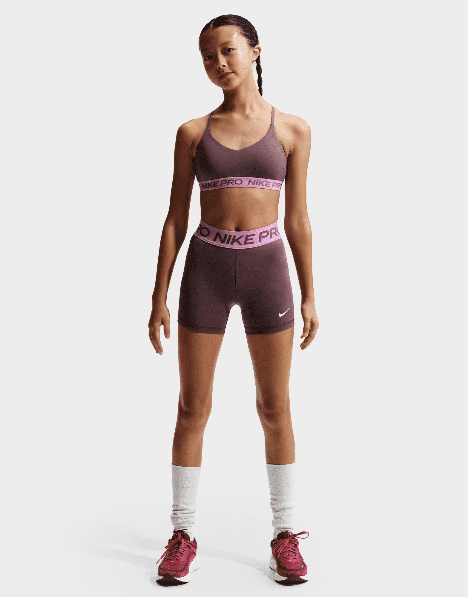 Keep her active in these girls' Nike 3-Inch Pro Dri-FIT Shorts. Featuring a standard fit with Dri-FIT moisture-wicking technology, they deliver comfortable performance in brown with pink and white accents. The 3-inch inseam offers coverage for training, running, or casual wear. Perfect for young athletes who demand comfort and style, these shorts combine Nike quality with practical design. Style Code: DA1033-502