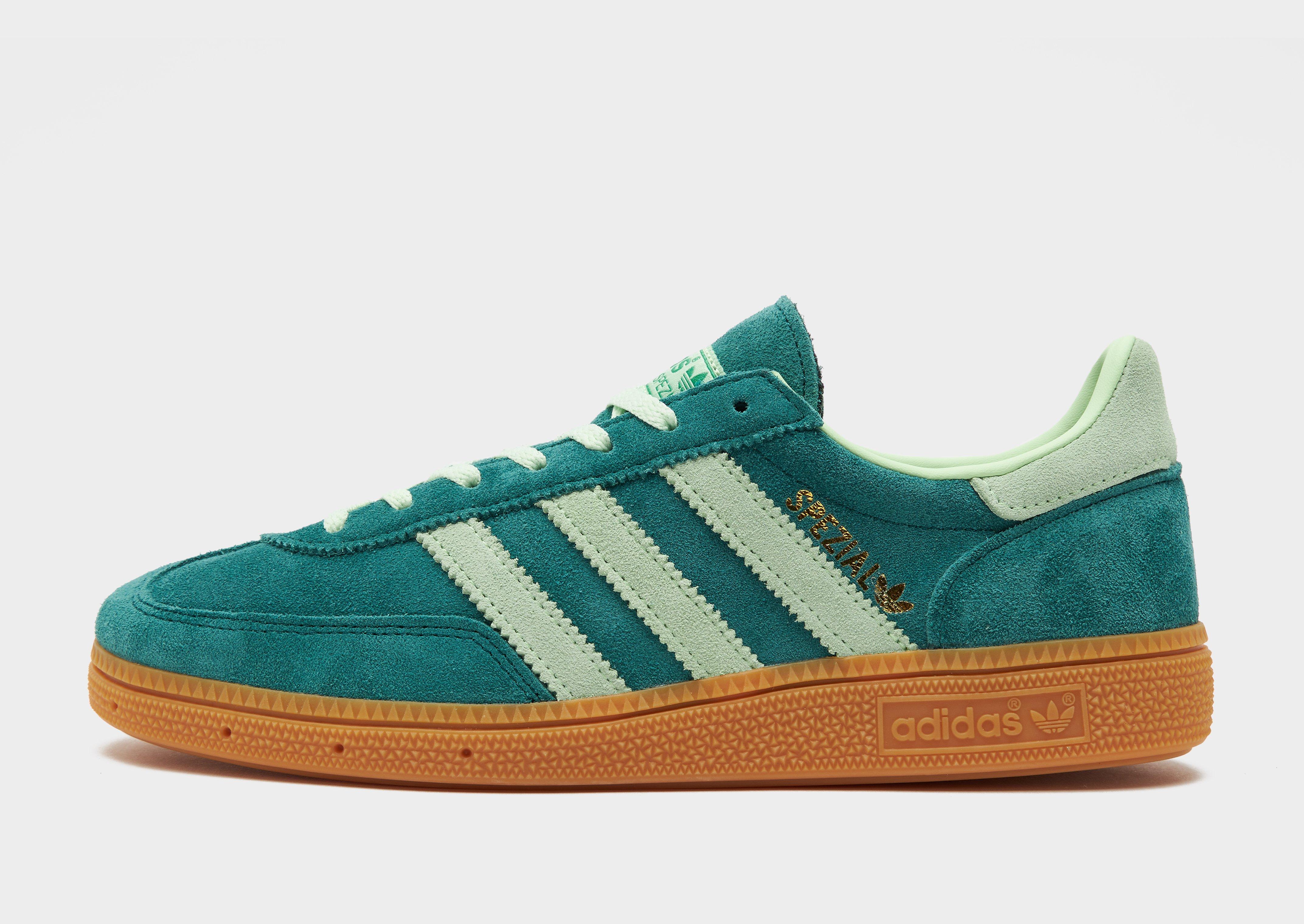 From the terrace to the street, rep a classic look with these women's Handball Spezial trainers from adidas Originals. Landing in a Green colourway, these kicks have an upper made with a suede and nylon upper for durable wear. They feature a lace fastening with a padded ankle collar for locked in fit and sit on a lightweight midsole. With a gum rubber outsole for total traction, they're signed off with the 3-Stripes to the sidewalls.