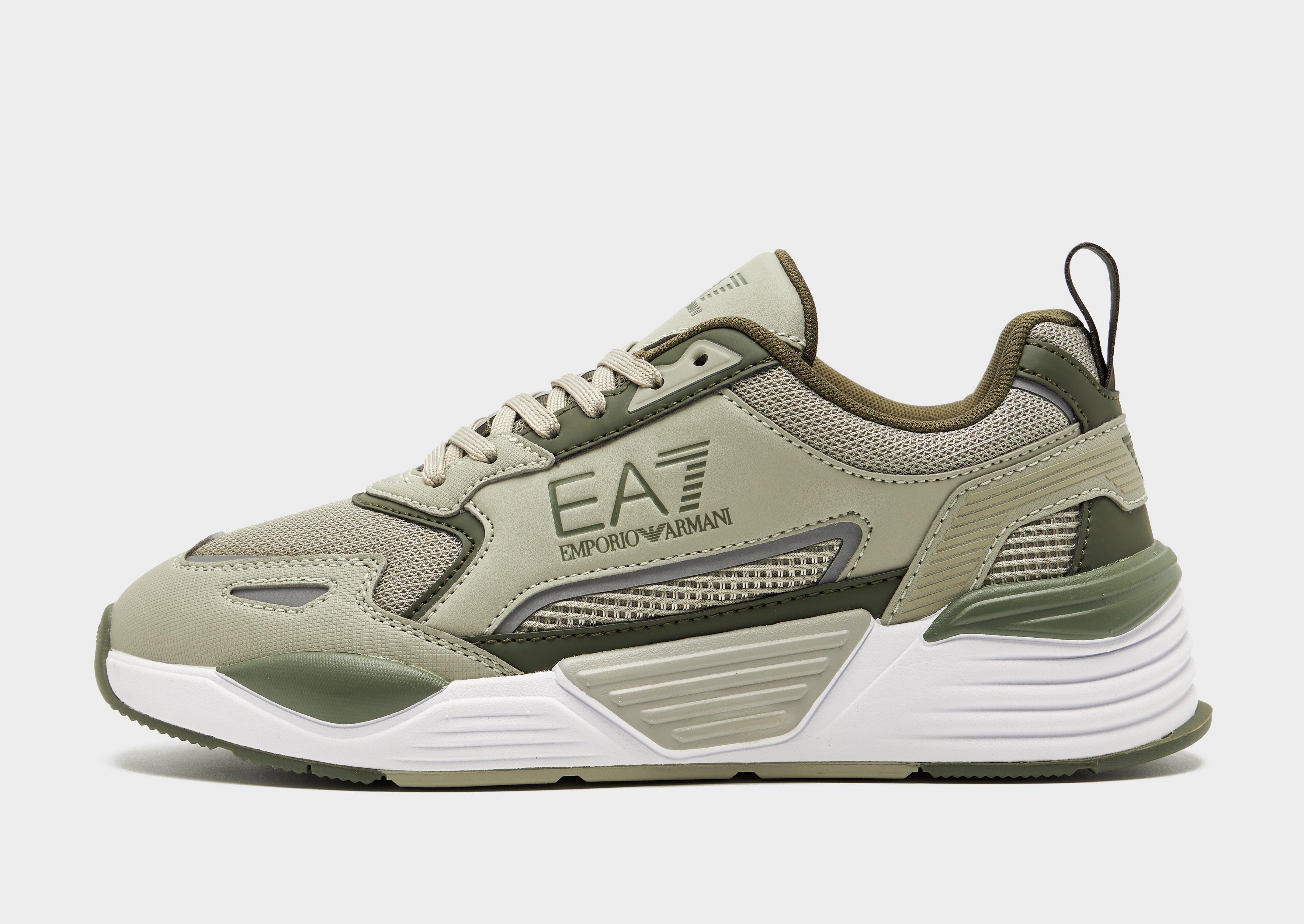 Switch up your rotation with premium style in these men's Ace Runners trainers from Emporio Armani EA7. In a Khaki colourway, these sneakers have a breathable mesh upper, with synthetic overlays for added support. They feature a tonal lace-up closure and pull tabs to the tongue and heel for easy access, as well as a plush ankle collar for step-in comfort. Underfoot, the chunky yet lightweight midsole provides a soft, springy ride, while the durable rubber outsole offers a grippy step. Finished off with signature EA7 branding to to the tongue pull and heel, with an oversized logo stamped to the sidewall. Style Code: 30818447MZ141