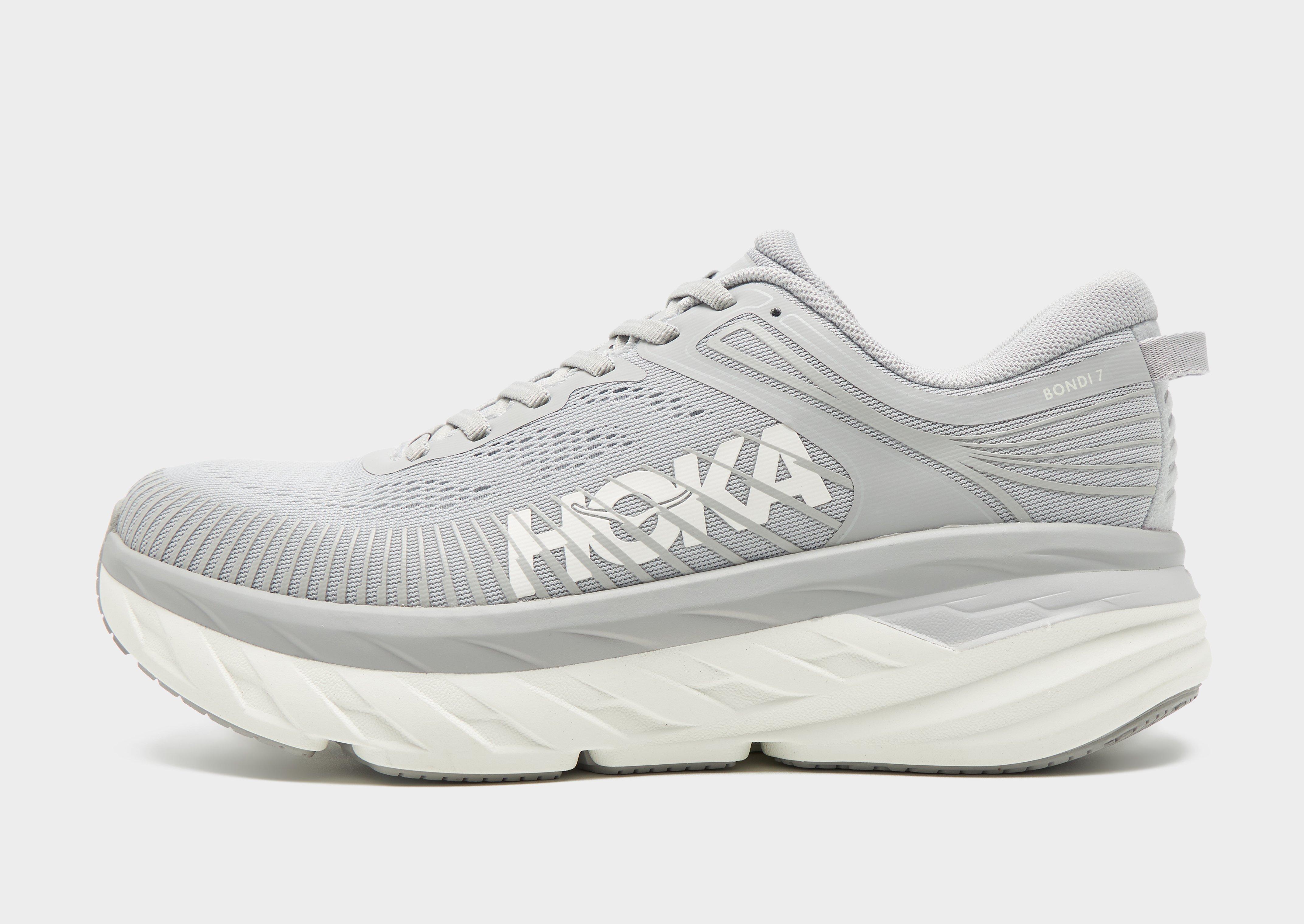 Make every mile count with these women's Bondi 7 running shoes from Hoka. In a Grey colourway with White details, these runners are cut from light, breathable mesh in the upper that includes 50% recycled polyester. They feature a lace fastening to lock you in, with a padded collar for added support and an Ortholite sockliner for a snug fit. Underfoot, they sit on a chunky foam midsole for a smooth ride, with a grippy rubber outsole for traction. With heel tabs for easy on-and-off, they're finished up with classic Hoka branding. Style Code: 1110519-HST