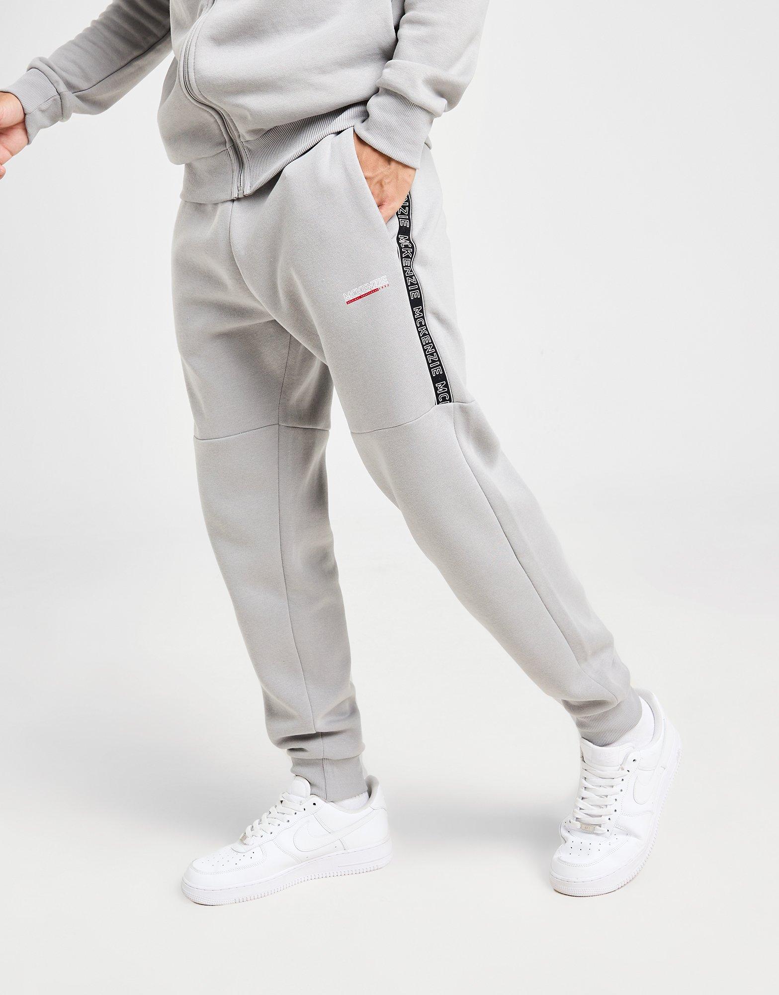 Freshen up your off-duty looks with these men's Essential Tape Joggers from McKenzie. In a Grey colourway, these regular-fit sweatpants are made with a soft cotton-blend fleece for lasting comofort. They have an elastic waistband with a drawstring to adjust the fit, and stretchy ribbed ankle cuffs for a secure fit. They have side pockets for easy storage, and are finished with tape detailing to the sides with repeat McKenzie branding, and a classic logo to the thigh. Machine washable. | Our model is 6'2" and wears a size medium.