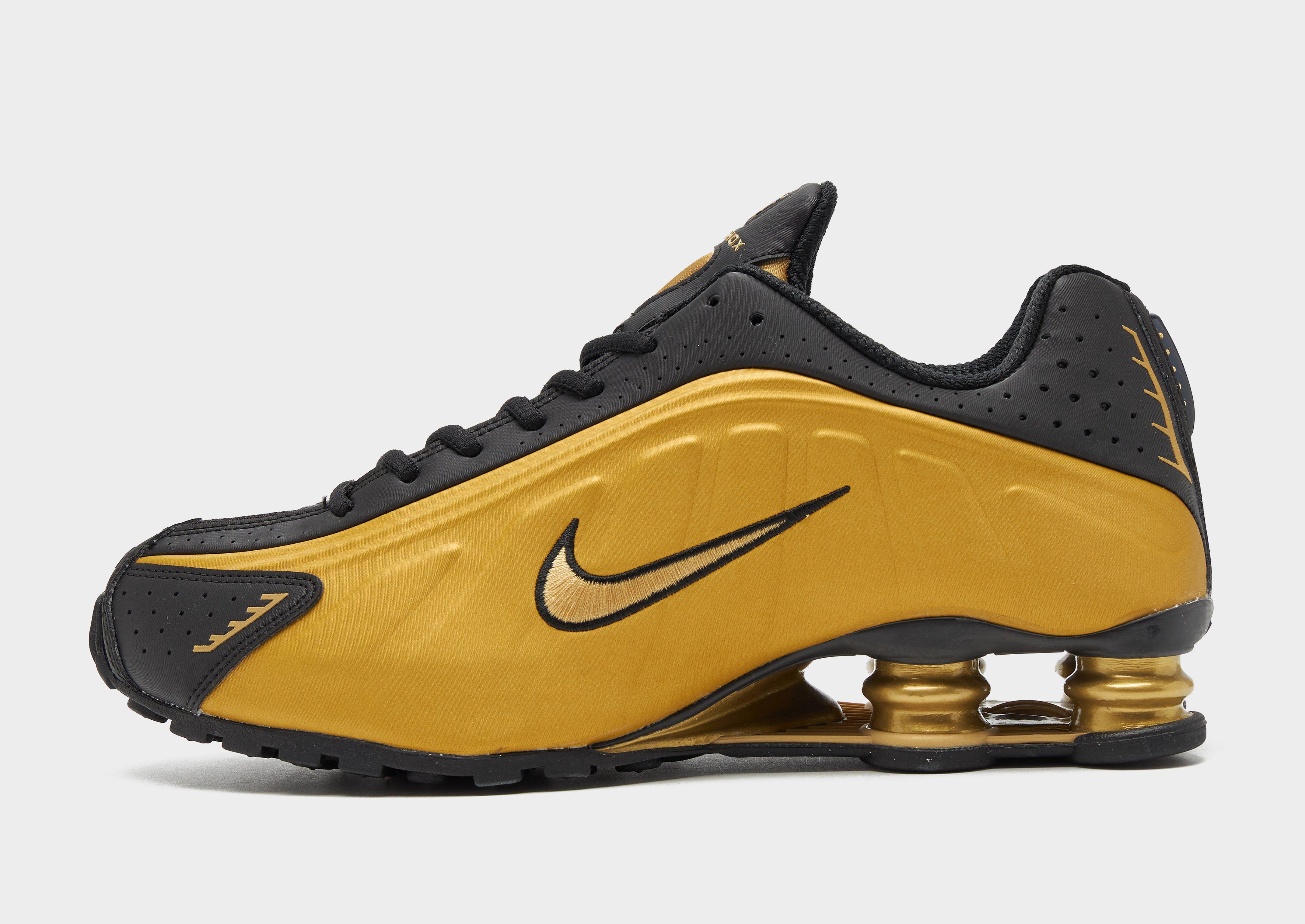Retro but futuristic, these men's Shox R4 sneakers from Nike bring back the 2003 icon in its OG form. In a Gold colourway with Black details, these statement shoes are built with a breathable mesh upper that features glossy TPU overlays and a tonal lace up fastening for a locked-in fit. Nike's iconic Shox tech sits underfoot, with a full-length midsole of springy Shox columns for a super comfy feel. With a grippy rubber sole, these trainers are finished with Shox branding to the tongue and the signature Swoosh logo embroidered to the sidewalls. Style Code: HQ1988-700