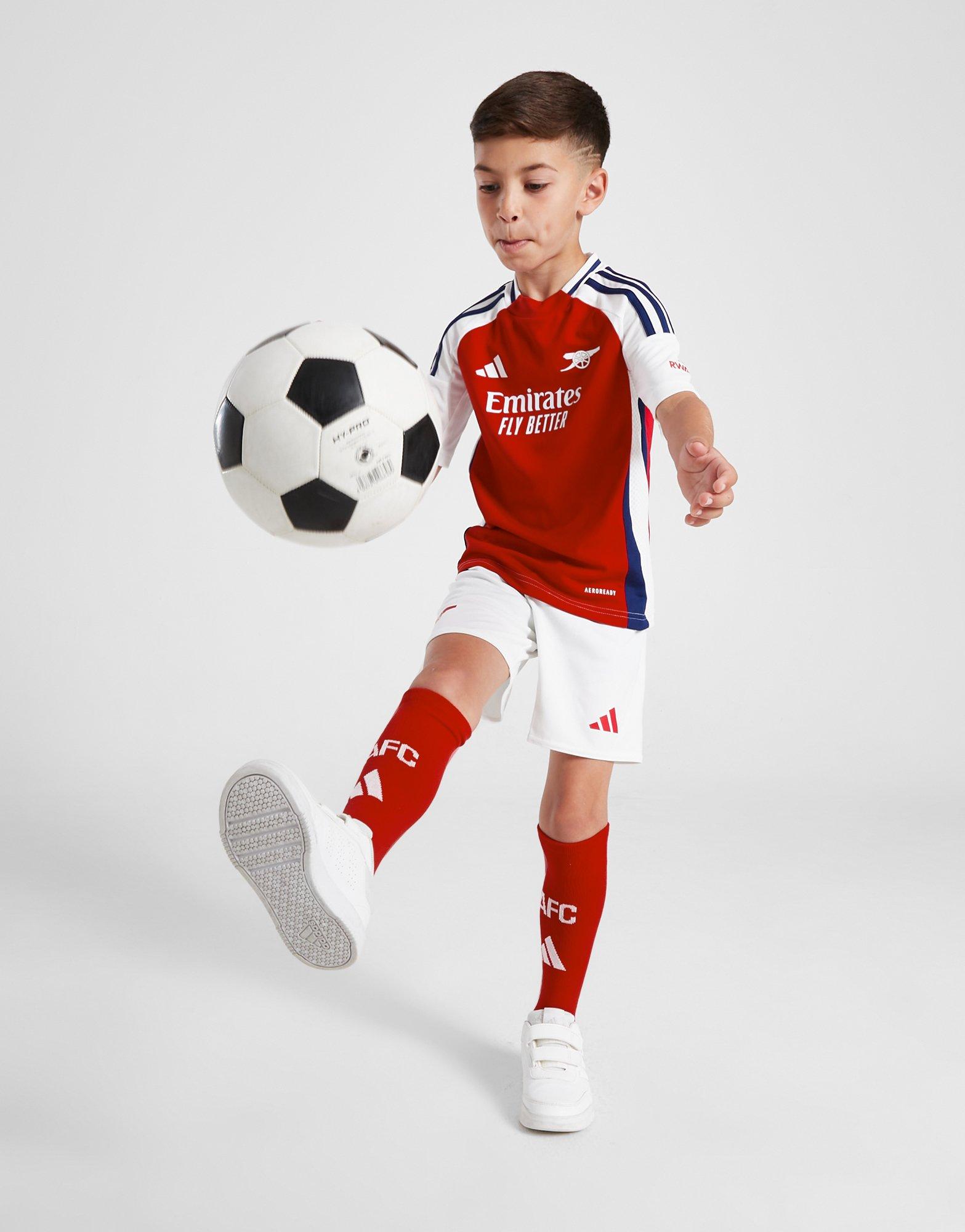 Get your little Gooner showing their support with this children's Arsenal FC 2024/25 Home Kit from adidas. In a Better Scarlet and White colourway, this kit is cut from light, breathable recycled polyester with built-in AEROREADY to remove sweat. It features a short sleeve shirt with a crew neckline, while the shorts have an elasticated waistband for a relaxed fit. With a pair of crew socks to complete the full set, it's finished with the Arsenal crest and Performance logo. Machine washable | IS8146