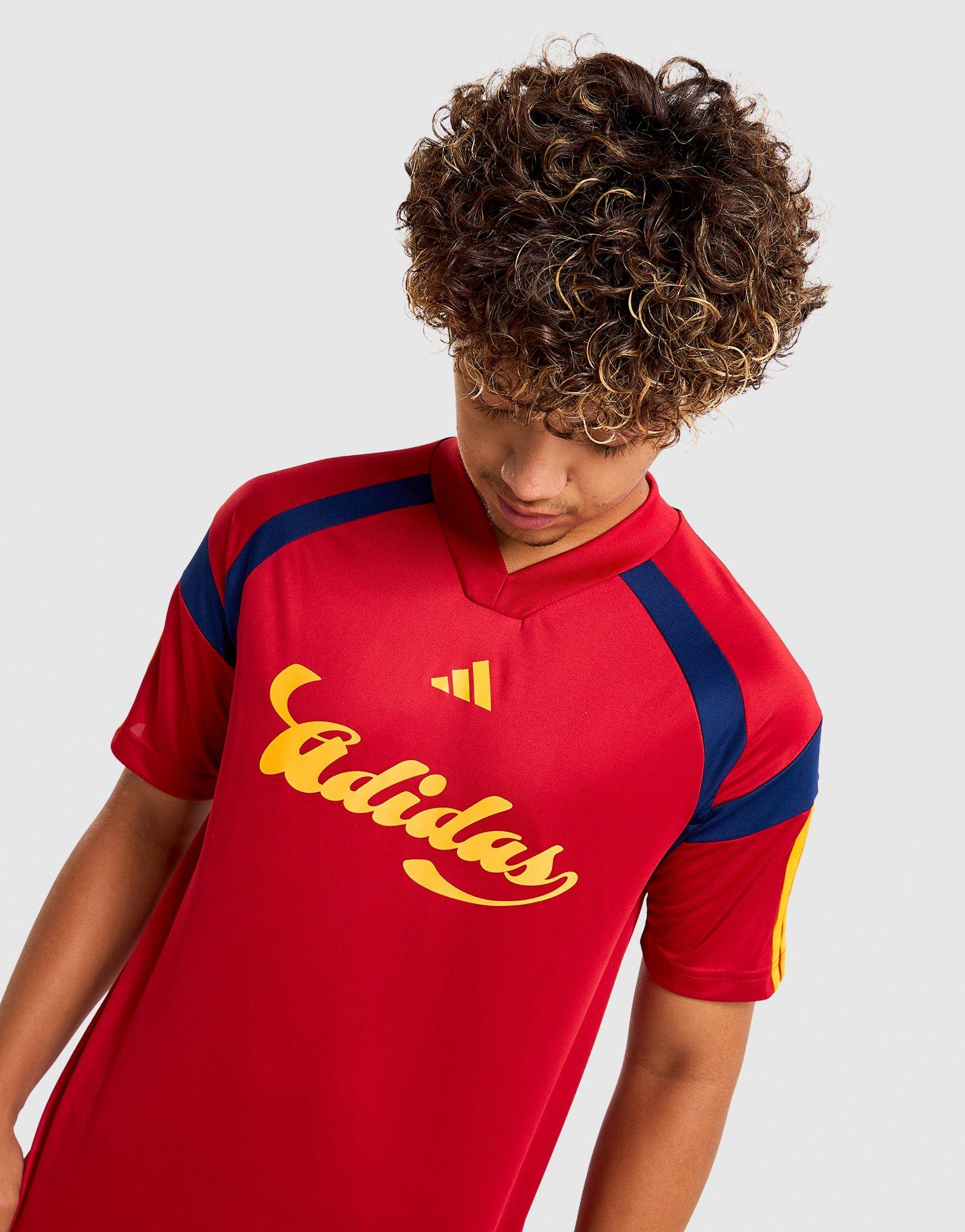 Where football culture meets street style, this kids' adidas House of Tiro T-Shirt is built for the moves on and off the pitch. Made from 100% recycled polyester in a pique construction, it's a lightweight and breathable option that keeps up with active kids throughout the day. The loose fit and V-neck design give it a relaxed, easy feel, while the Team Power Red 2 colourway with Crew Yellow and Dark Blue details brings a bold, football-inspired energy. Applied 3-Stripes branding and a heat-transferred 3 Bar Logo keep the adidas signature front and centre. A great everyday kids' adidas football tee that pairs back to shorts, joggers, or your favourite kit.