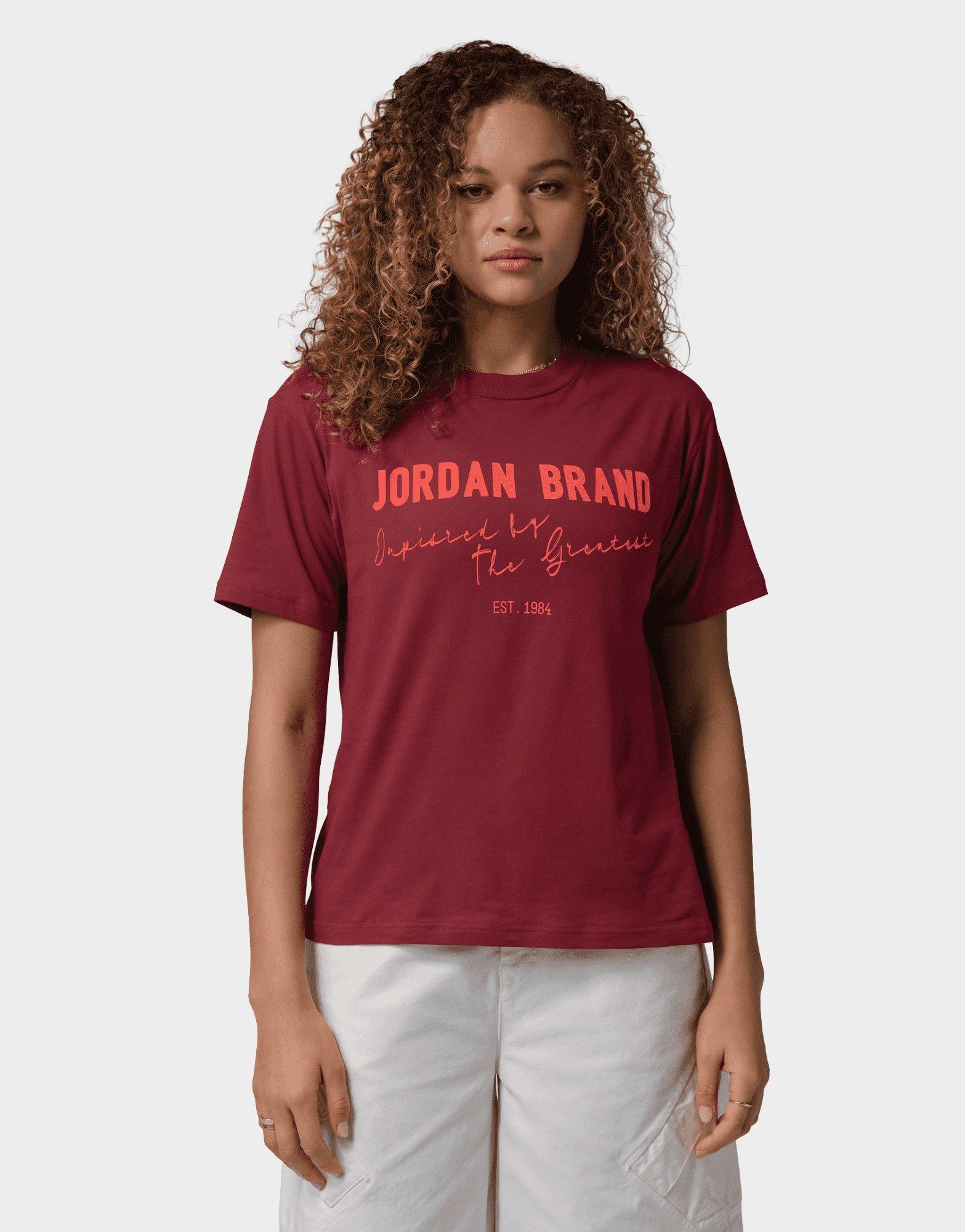 Stand out in this women's Jordan Brand Graphic T-Shirt in bold red. Built with a standard fit and short sleeves, it showcases striking graphic branding for authentic Jordan style. The vibrant red-on-red colourway makes a confident statement whether you're hitting the streets or keeping it casual. Designed for comfort and basketball-inspired edge, this tee is perfect for Jordan fans who love head-turning looks. Style Code: IF0809-677