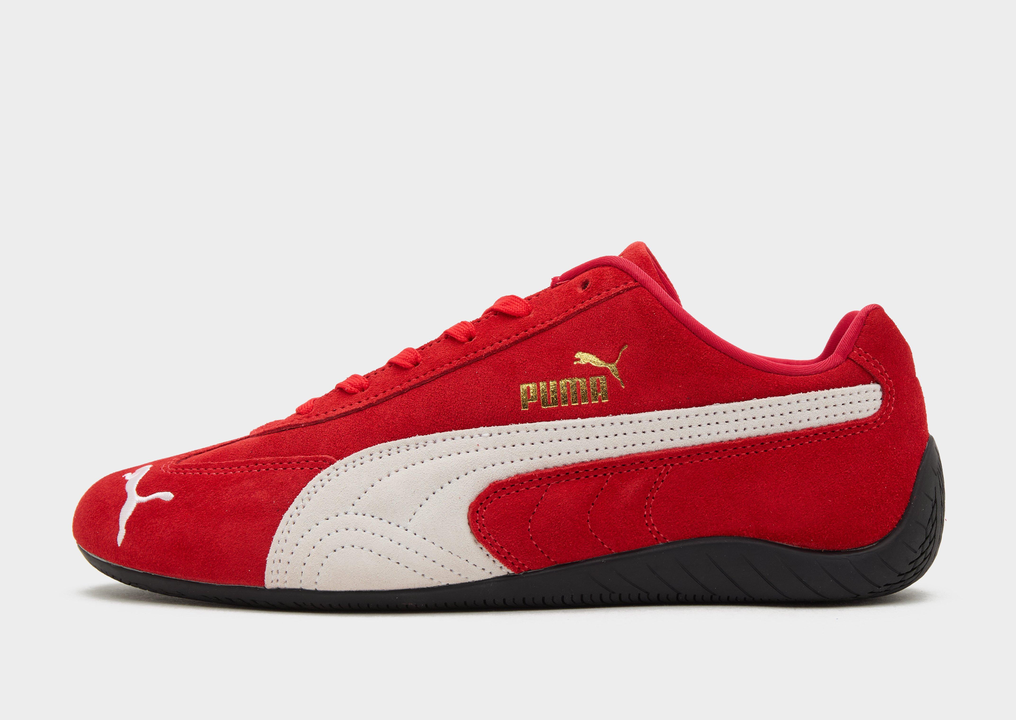 The iconic silhouette returns with the men's Speedcat OG sneaker from Puma. Landing in a Red colourway with White details, its low profile silhouette is paired with sleek details inspired by motorsport racing. The shoe's popularity has taken it from motor racing to the fashion world, with its vibrant colours and easy to wear design making it a must-have staple for your sneaker rotation. Crafted from a leather upper for an elevated look, a rubber outsole underneath provides traction. Finished off with the signature PUMA formstrip to the and gold foil branding to the sidewalls, and the iconic PUMA silhouette embroidered to the toebox. Style Code: 39884602