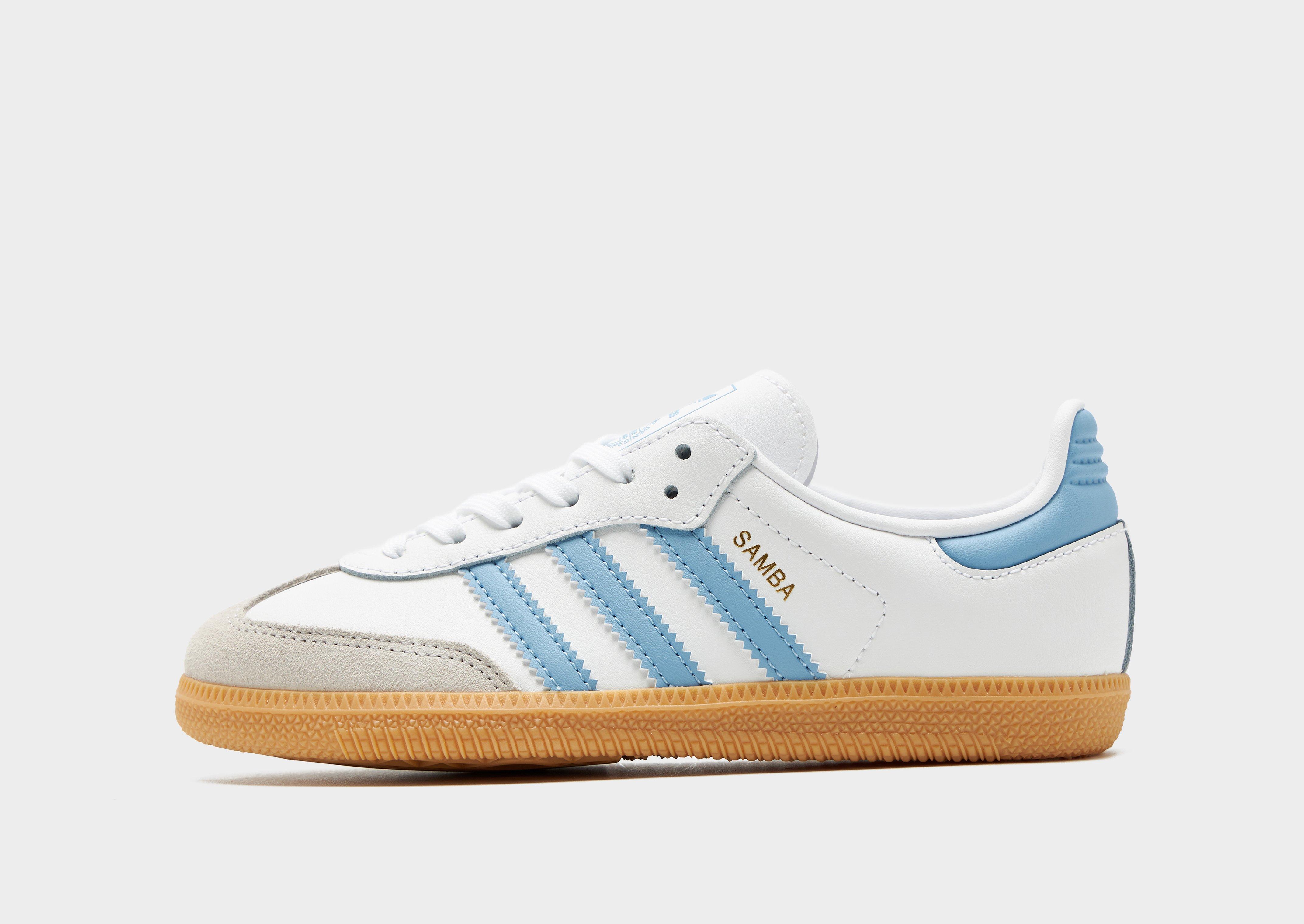 Add a streetwear icon to your footwear rotation with these children's Samba OG shoes from adidas Originals. Taking cues from the original football-inspired Samba design first introduced in the 1950s, these iconic terrace sneakers let you imagine you're walking in those vintage footsteps. Built with a White leather upper, they feature a suede toe guard and are sat upon a responsive gum midsole. With tonal laces and signature adi 3-stripes to the side in Blue, they're signed off with 'Samba' wording to the side, and iconic Trefoil branding to the tongue. Style Code: JQ2828