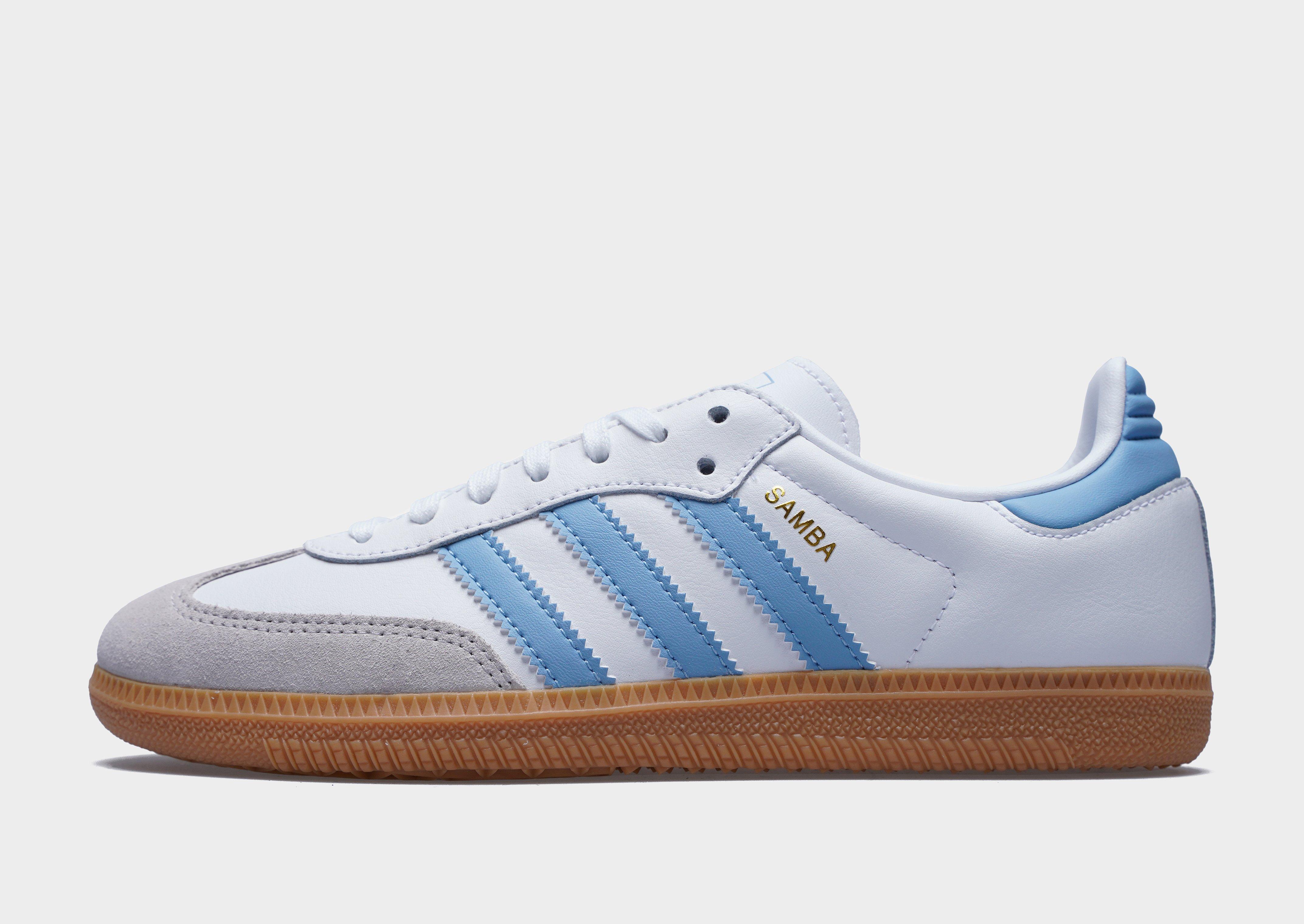 Add a streetwear icon to your footwear rotation with these junior's Samba OG shoes from adidas Originals. Taking cues from the original football-inspired Samba design first introduced in the 1950s, these iconic terrace sneakers let you imagine you're walking in those vintage footsteps. Built with a White leather upper, they feature a suede toe guard and are sat upon a responsive gum midsole. With tonal laces and signature adi 3-stripes to the side in Blue, they're signed off with 'Samba' wording to the side, and iconic Trefoil branding to the tongue. Style Code: JQ2832