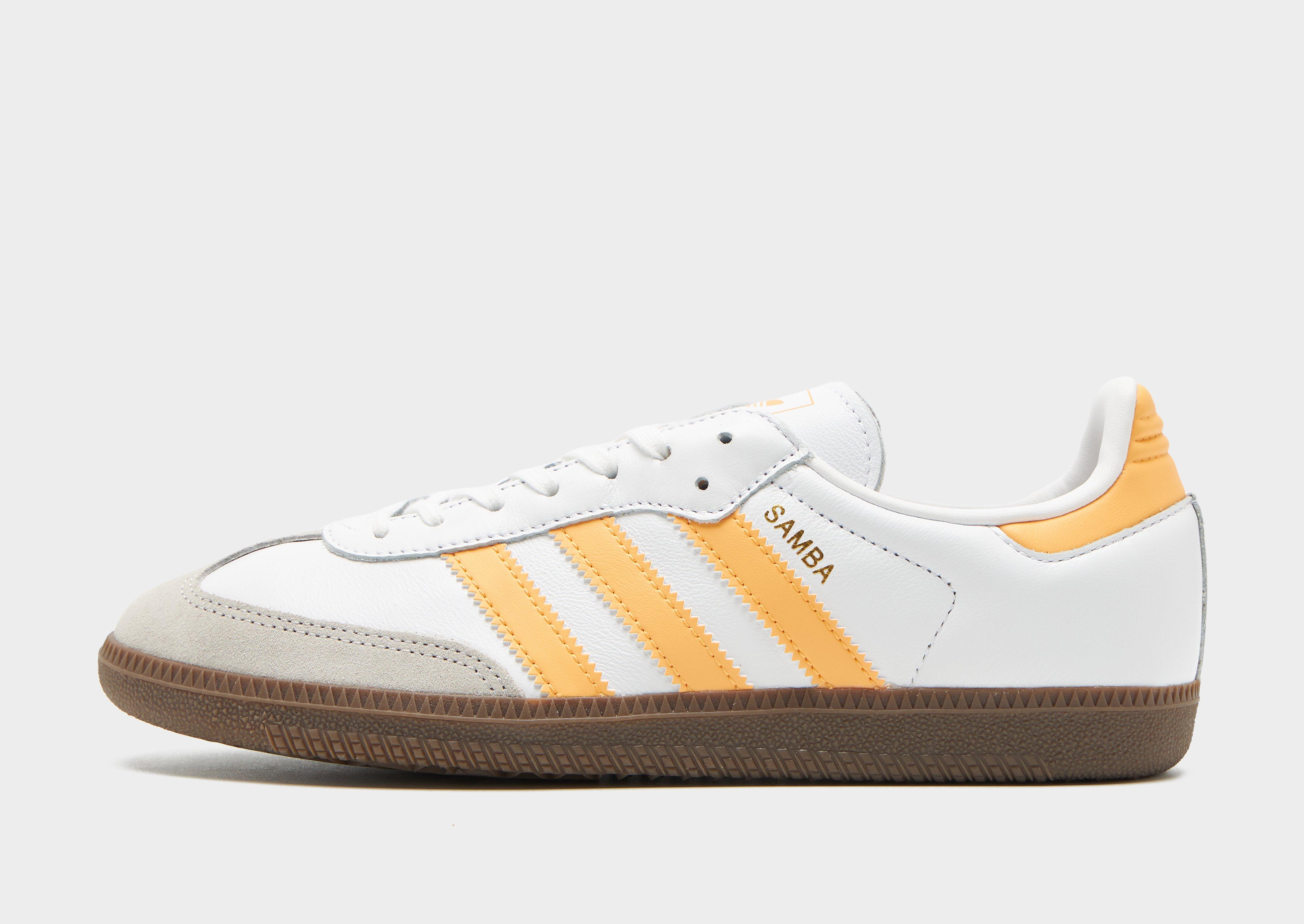 Add a streetwear icon to your footwear rotation with these junior's Samba OG shoes from adidas Originals, exclusive to JD. Taking cues from the original football-inspired Samba design first introduced in the 1950s, these iconic terrace sneakers let you imagine you're walking in those vintage footsteps. Built with a White leather upper, they feature a suede toe guard and are sat upon a responsive gum midsole. With tonal laces and signature adi 3-stripes to the side in Orange, they're signed off with 'Samba' wording to the side, and iconic Trefoil branding to the tongue. Style Code: JR3131