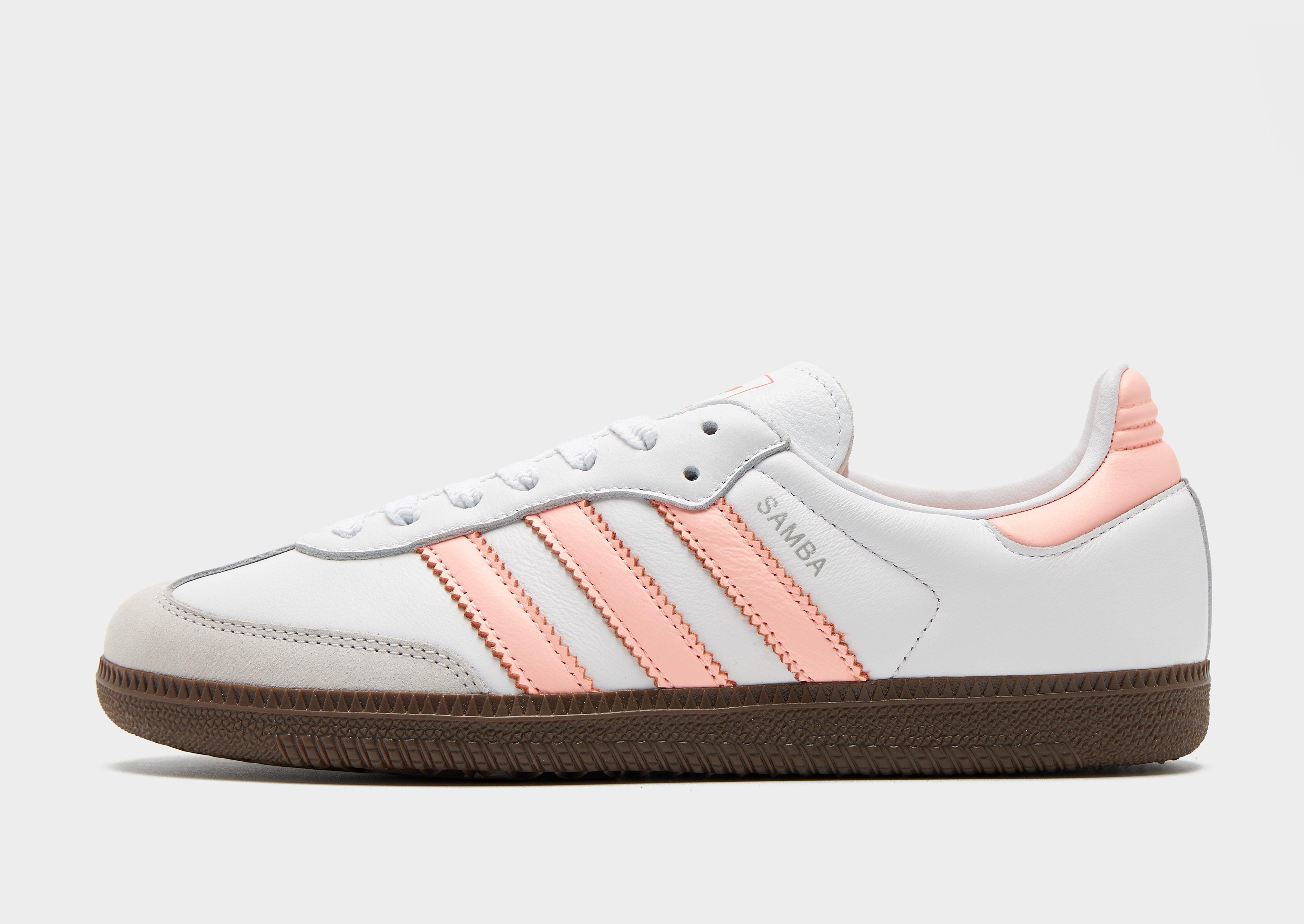 Add a streetwear icon to your footwear rotation with these women's Samba OG shoes from adidas Originals, exclusive to JD. Taking cues from the original football-inspired Samba design first introduced in the 1950s, these iconic terrace sneakers let you imagine you're walking in those vintage footsteps. Built with a White leather upper, they feature a suede toe guard and are sat upon a responsive gum midsole. With tonal laces and signature adi 3-stripes to the side in Peach, they're signed off with 'Samba' wording to the side, and iconic Trefoil branding to the tongue. Style Code: JH5687