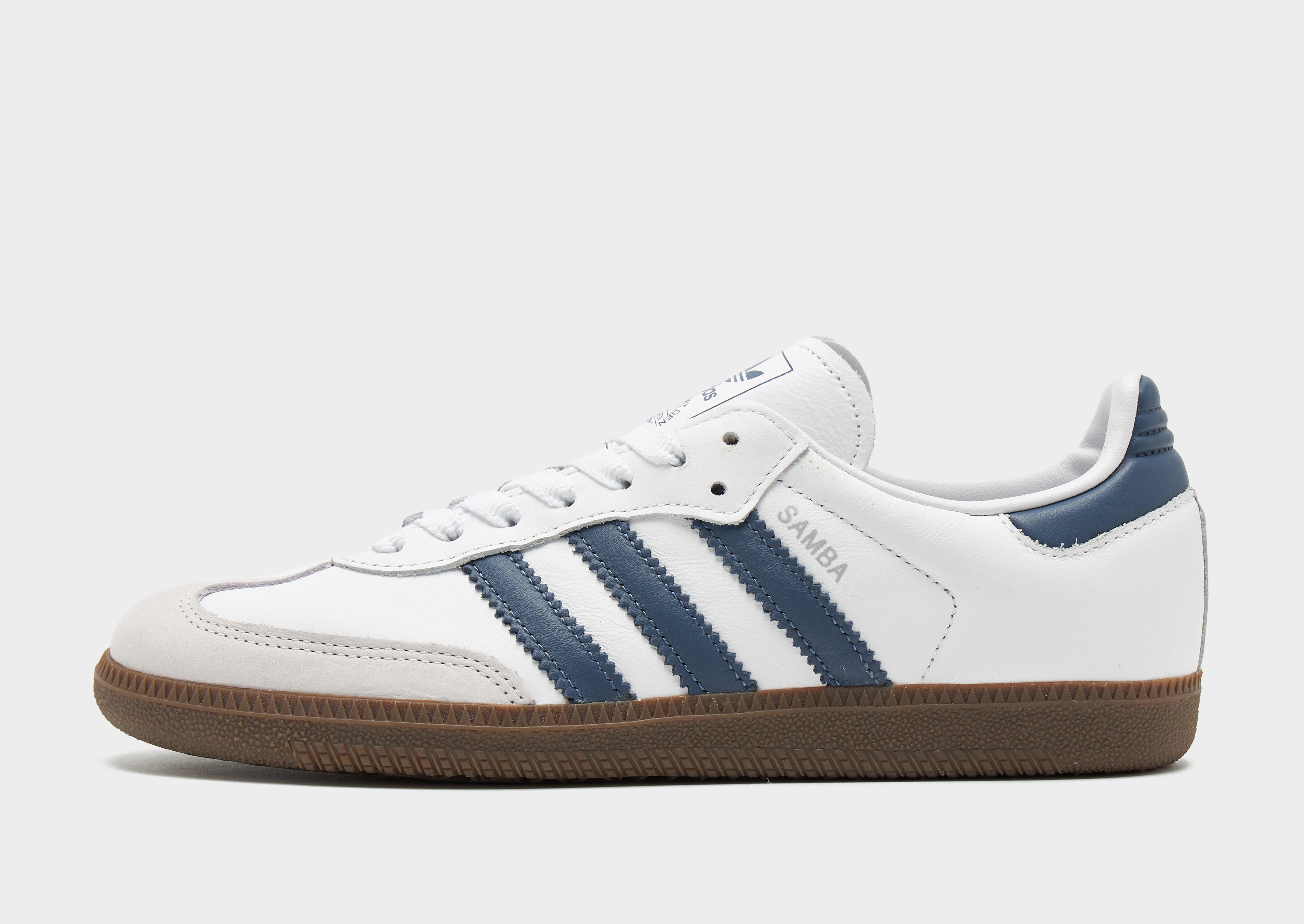 Add a streetwear icon to your footwear rotation with these women's Samba OG shoes from adidas Originals, exclusive to JD. Taking cues from the original football-inspired Samba design first introduced in the 1950s, these iconic terrace sneakers let you imagine you're walking in those vintage footsteps. Built with a White leather upper, they feature a suede toe guard and are sat upon a responsive gum midsole. With tonal laces and signature adi 3-stripes to the side in Navy, they're signed off with 'Samba' wording to the side, and iconic Trefoil branding to the tongue. Style Code: JH5688