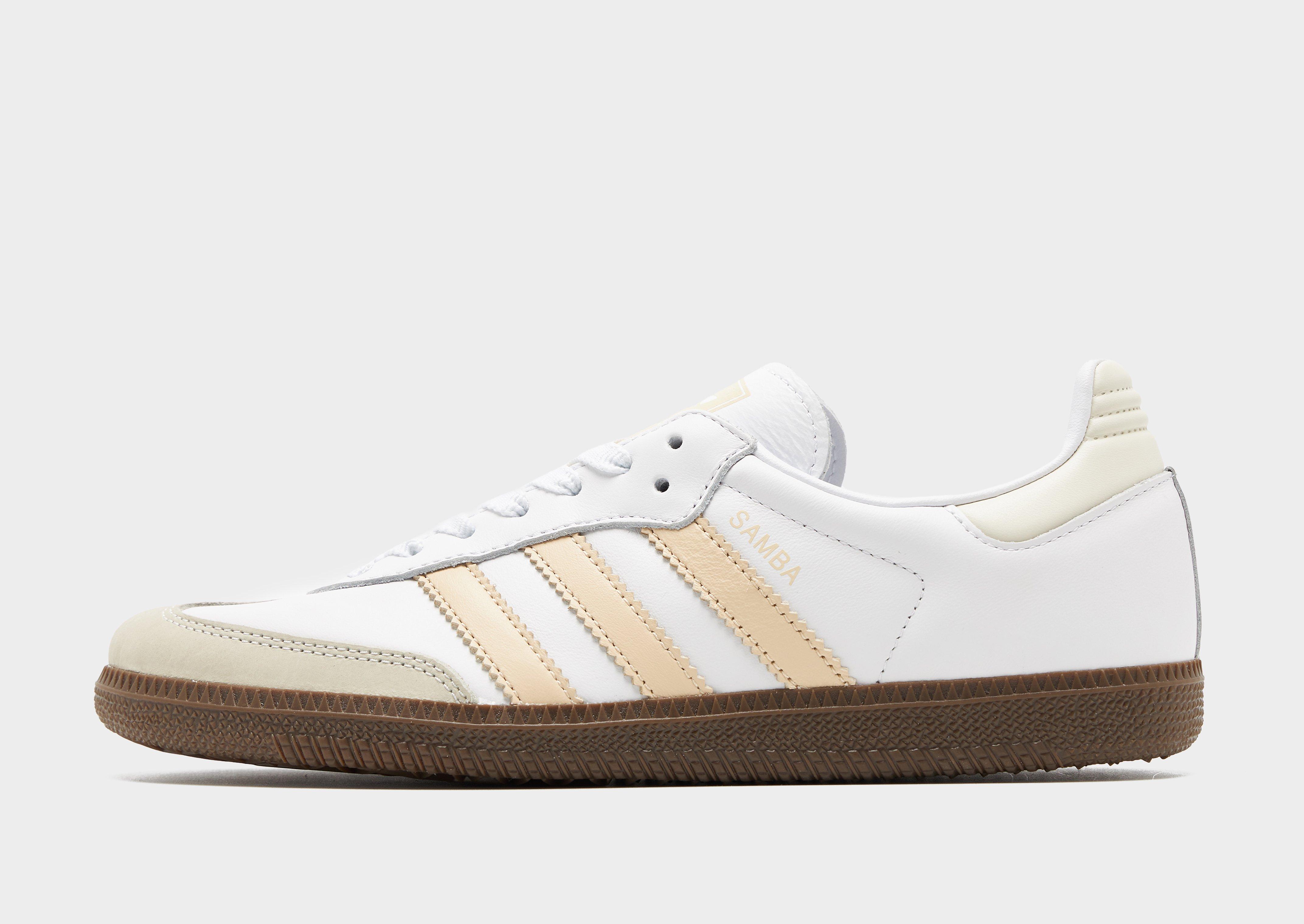 Add a streetwear icon to your footwear rotation with these women's Samba OG shoes from adidas Originals, exclusive to JD. Taking cues from the original football-inspired Samba design first introduced in the 1950s, these iconic terrace sneakers let you imagine you're walking in those vintage footsteps. Built with a White leather upper, they feature a suede toe guard and are sat upon a responsive gum midsole. With tonal laces and signature adi 3-stripes to the side in Tan, they're signed off with 'Samba' wording to the side, and iconic Trefoil branding to the tongue. Style Code: JH7300