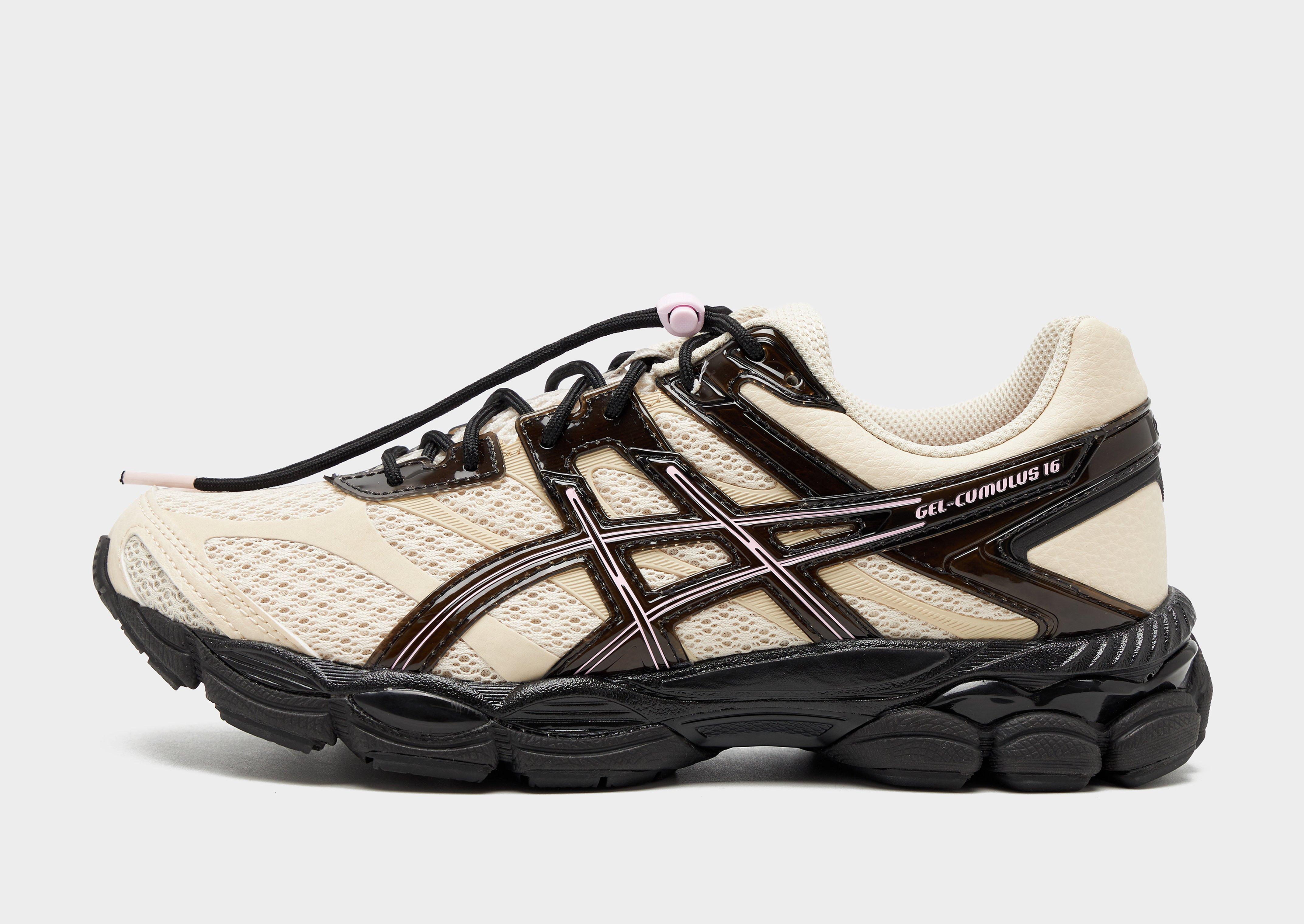 Running roots. Now set for the streets. Catch up over coffee in these women's GEL-CUMULUS 16 sneakers from ASICS. Sand and Black hit the mesh and synthetic upper, paired with ASICS' classic banding. Down below, GEL inserts work with FLUIDRIDE tech for a super soft and smooth step. Finished off with a rubber outsole to match.