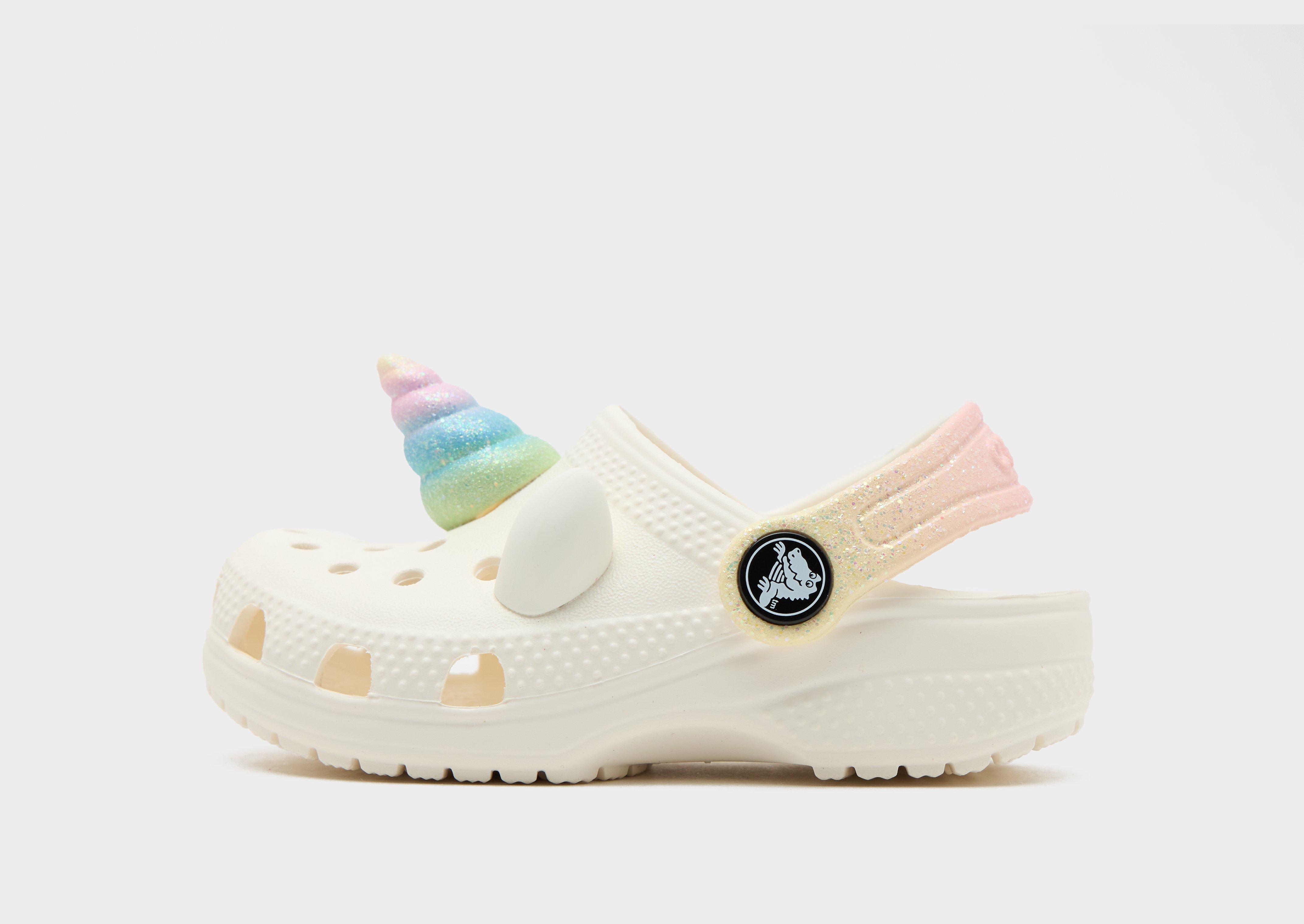 Get them set for the new season with these infants' Classic Clogs from Crocs. In a White colourway, these clogs have fun unicorn details fixed to the upper so your little one can show off their love for unicorns. They're made with a smooth, water-resistant synthetic upper for supreme comfort, and feature breathable ports for ventilation and an adjustable strap for a secure fit. With a Croslite midsole to keep your little one comfy, these sandals are finished with a grippy rubber outsole for traction and signature Crocs branding to the heel. Please note: Crocs fit wide. If you have narrow feet, we recommend that you size down. Crocs come with the US size embossed to the sole.