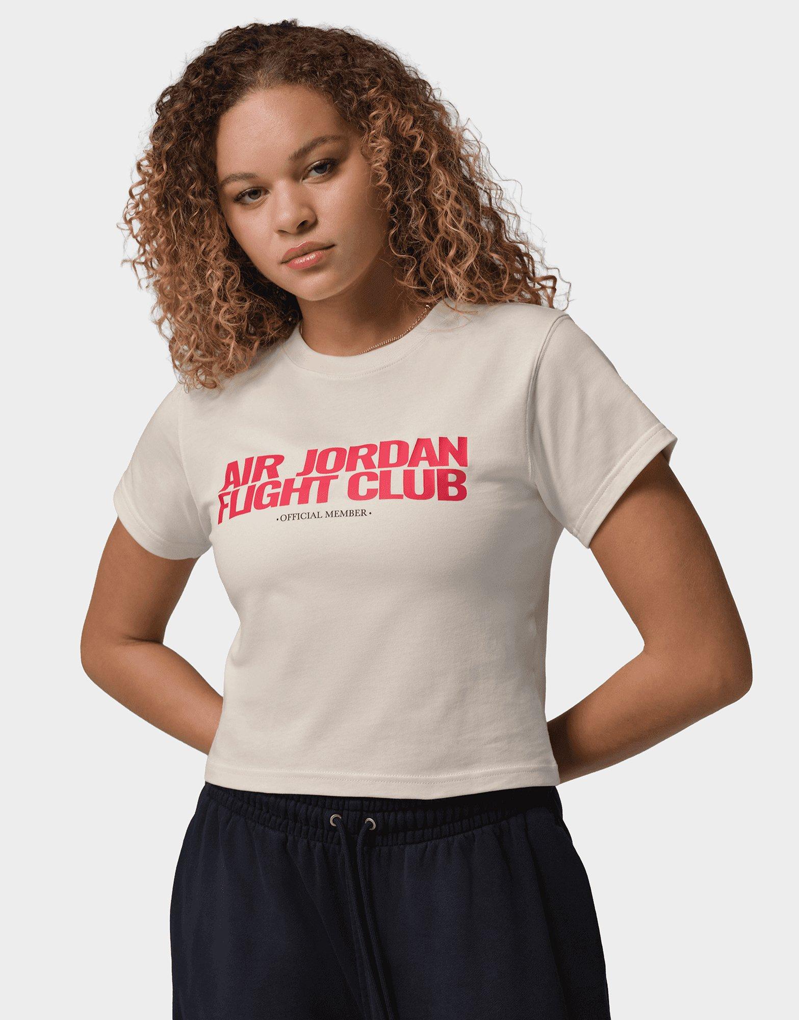 Elevate your style with this women's Jordan Cropped AJ Flight Club Graphic T-Shirt. Designed with a standard fit and crop length, it features Flight Club graphics in off-white with red accents. The cropped silhouette pairs perfectly with high-waisted leggings or joggers for contemporary athletic looks. Built with Jordan quality and bold branding, this tee brings basketball heritage to modern streetwear. Style Code: IF3572-110