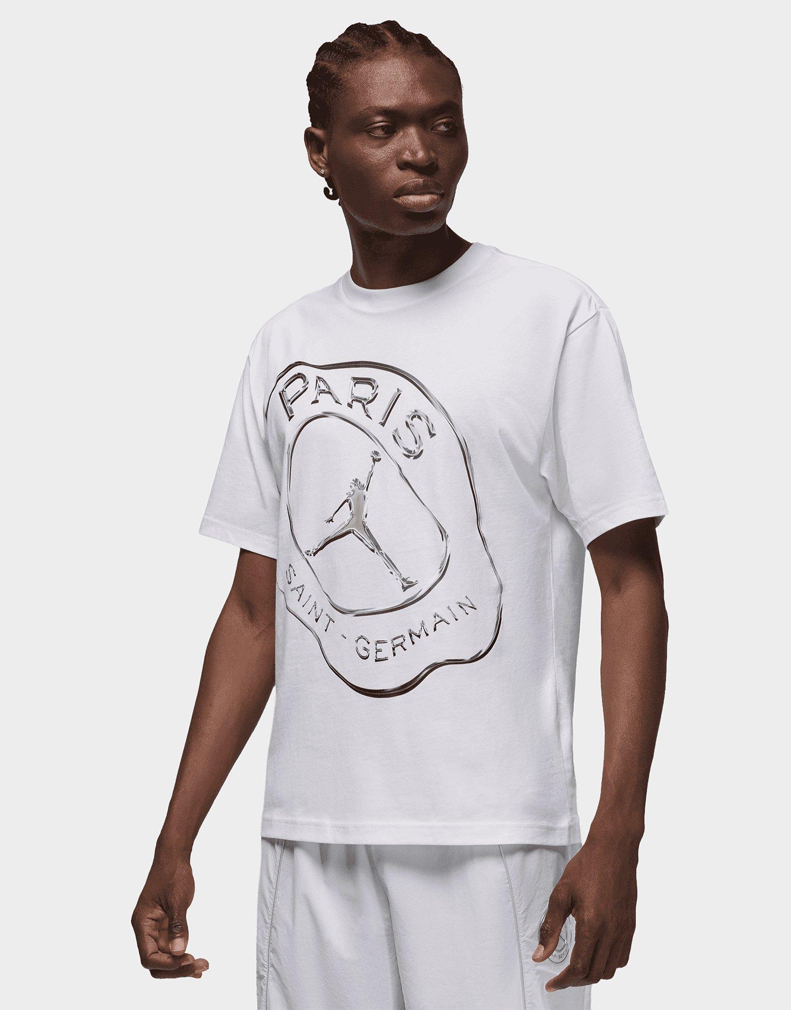 Show your PSG pride with this men's Jordan x Paris Saint-Germain T-Shirt. Featuring a standard fit and short sleeves, it showcases high brand read PSG branding in white with silver accents. The clean colourway makes it perfect for pairing with joggers or jeans. Built with Jordan quality and authentic club graphics, this tee celebrates the legendary partnership between Jordan and Paris Saint-Germain. Style Code: IF3807-100