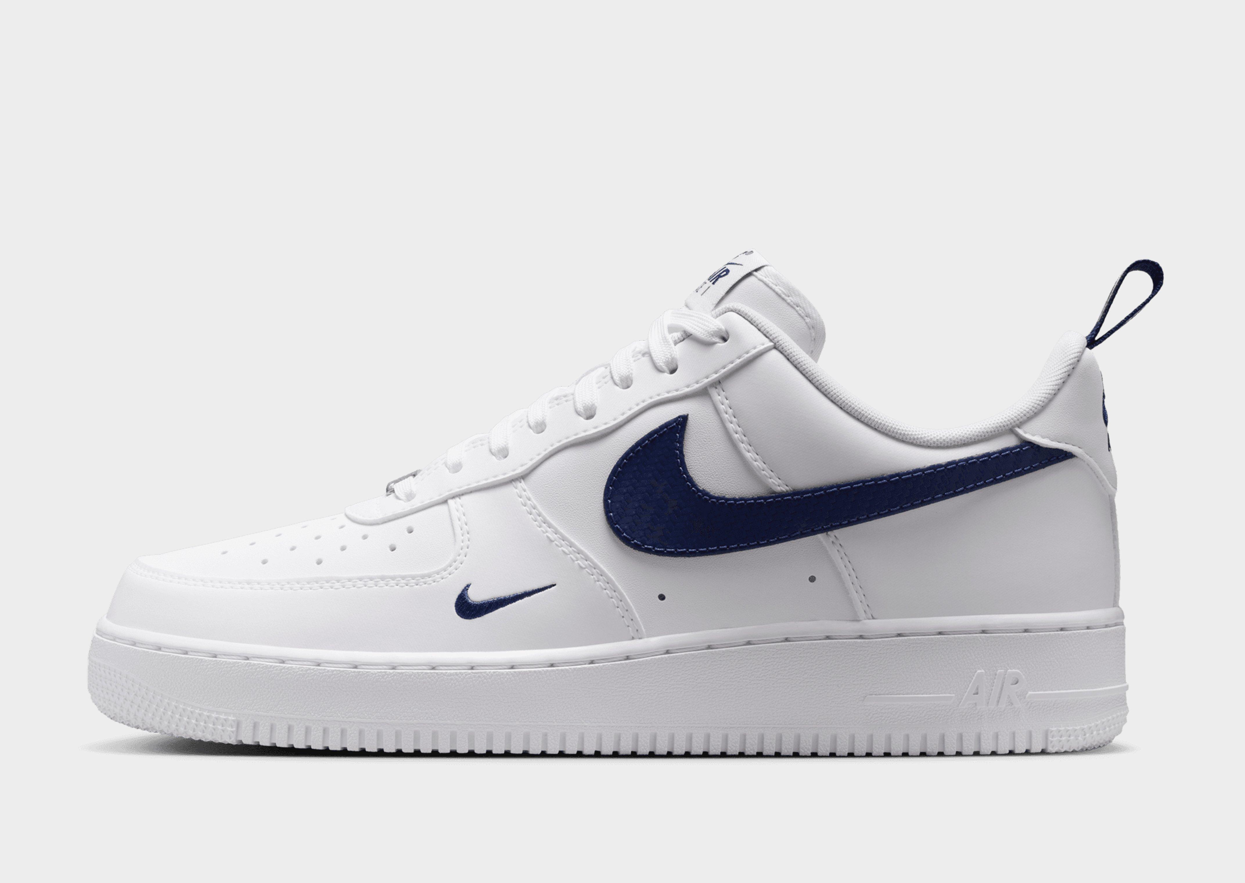 The Air Force 1 Low Essential keeps it clean and classic - the men's Nike Air Force 1 Low in white with midnight navy details is a timeless retro sneaker built for those who appreciate sport-heritage style at its purest. The leather upper softens and gains vintage character with wear, while Nike Air cushioning delivers reliable all-day comfort rooted in the shoe's original hoops DNA. A padded low-cut collar and perforated toe box keep it breathable and sharp, with the navy Swoosh adding just enough contrast against the crisp white base. A wardrobe non-negotiable for men who know a classic when they see one. Exclusive to JD.