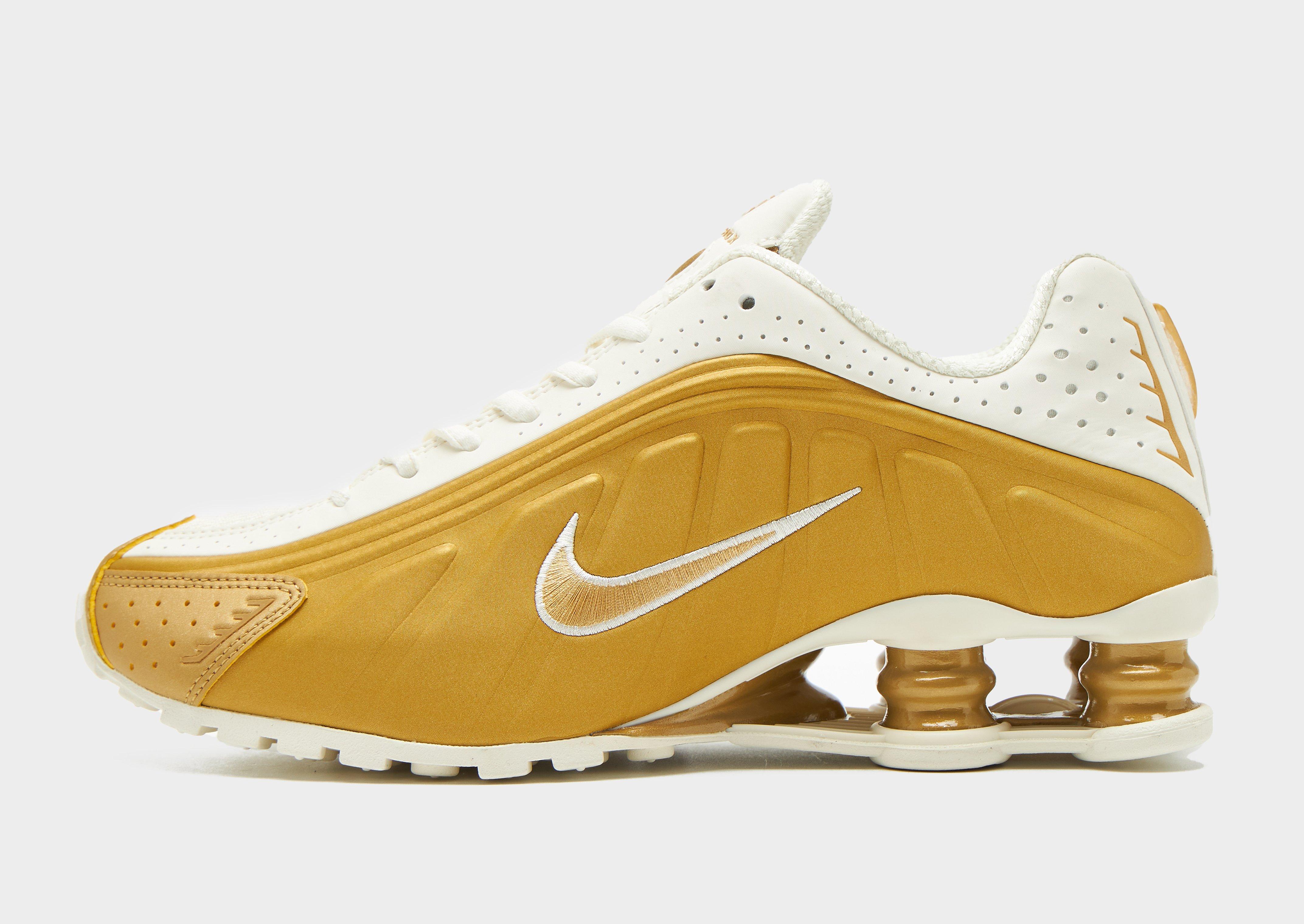Retro but futuristic, these women's Shox R4 sneakers from Nike bring back the 2003 icon in its OG form. In a Cream colourway with Gold details, these statement shoes are built with a breathable mesh upper that features glossy TPU overlays and a tonal lace up fastening for a locked-in fit. Nike's iconic Shox tech sits underfoot, with a full-length midsole of springy Shox columns for a super comfy feel. With a grippy rubber sole, these trainers are finished with Shox branding to the tongue and the signature Swoosh logo embroidered to the sidewalls. Style Code: AR3565-010