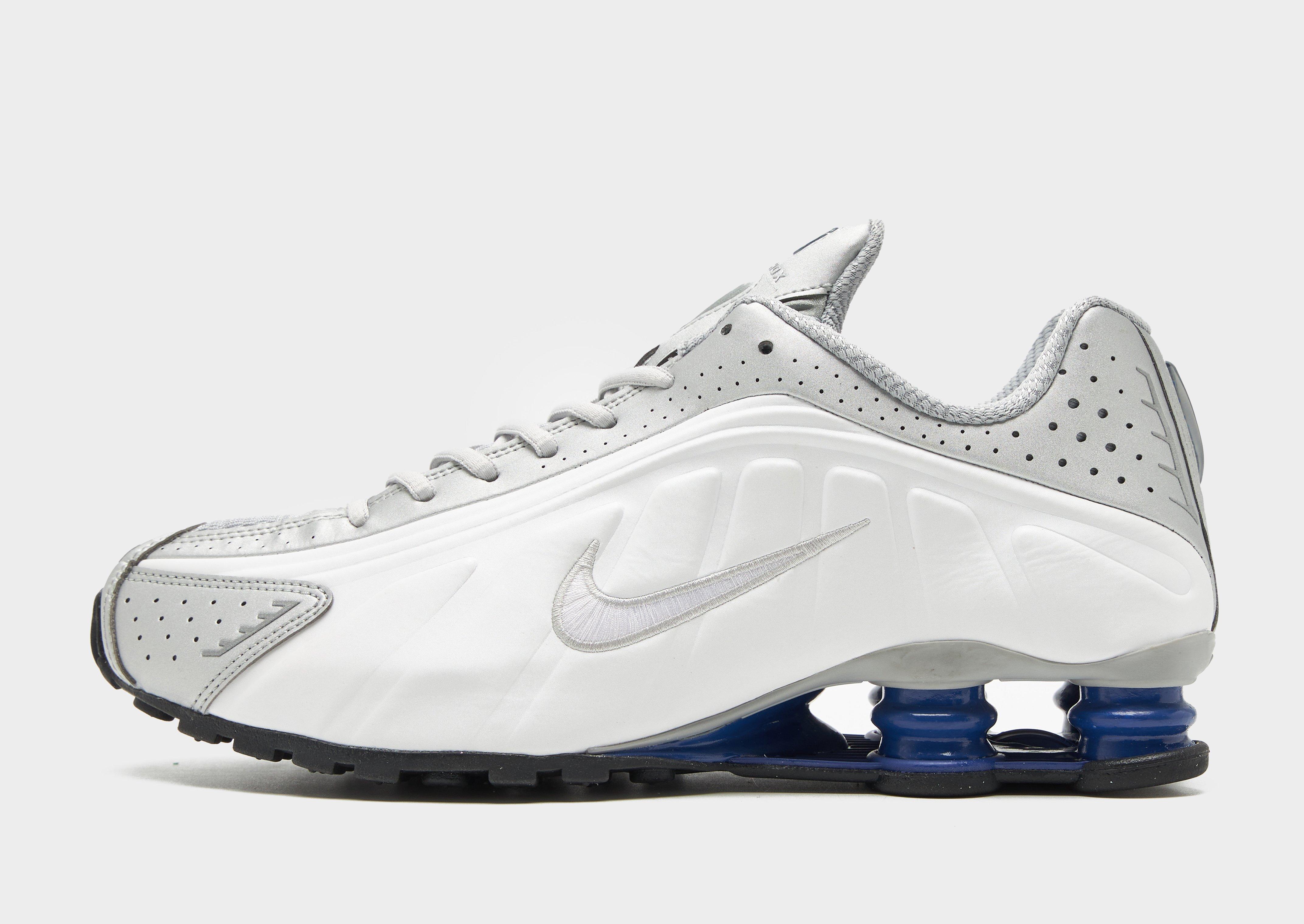 Retro but futuristic, these men's Shox R4 sneakers from Nike bring back the 2003 icon in its OG form. In a White colourway with Silver details, these statement shoes are built with a breathable mesh upper that features glossy TPU overlays and a tonal lace up fastening for a locked-in fit. Nike's iconic Shox tech sits underfoot, with a full-length midsole of springy Shox columns for a super comfy feel. With a grippy rubber sole, these trainers are finished with Shox branding to the tongue and the signature Swoosh logo embroidered to the sidewalls. Style Code: HQ1988-102
