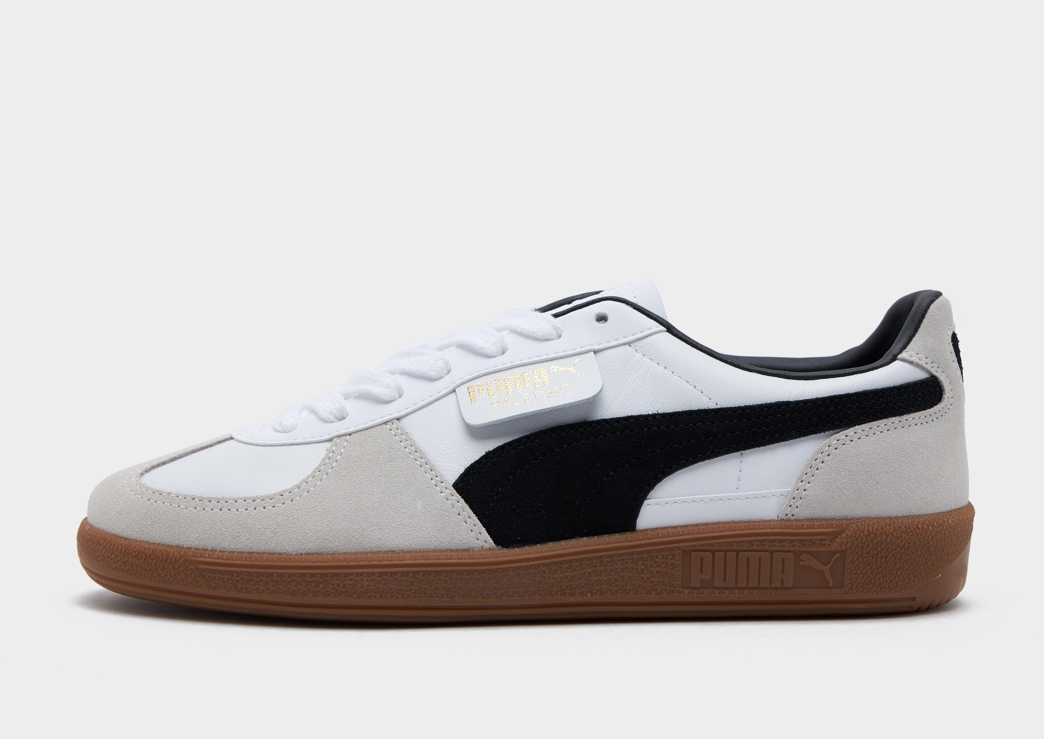 Back from the early '80s, these men's Palermo Leather trainers from PUMA deliver heritage style on the streets. Inspired by the terraces, the White upper has a blend of leather and suede panels throughout, with the classic T-toe design adding durability. Featuring a padded ankle collar and a tonal lace-up front, they're sat above a low-profile Gum sole for lightweight cushioning and all-day grip. Finished off with Black Formstrips on the sidewalls, a Cat window at the heel and the signature PUMA tab next to the laces.