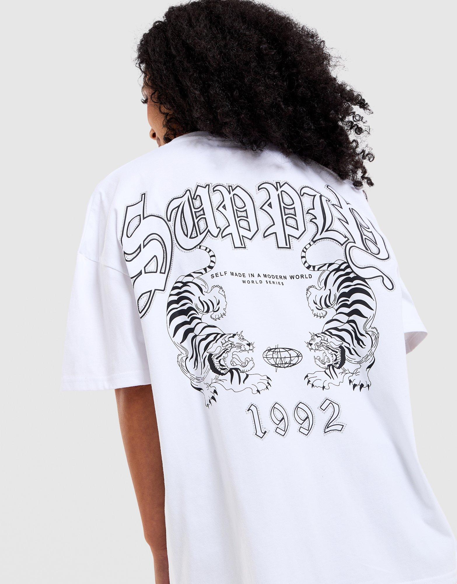 Make a bold impression with this women's Supply & Demand Tiger Graphic T-Shirt, exclusive to JD. Featuring an oversized fit and short sleeves, it showcases striking tiger graphics on both the front and back for maximum impact. The white colourway with black detailing keeps things clean and versatile for streetwear styling. Perfect for pairing with joggers, jeans, or biker shorts, this tee brings fierce attitude to casual looks. Style Code: SUPTW18240010