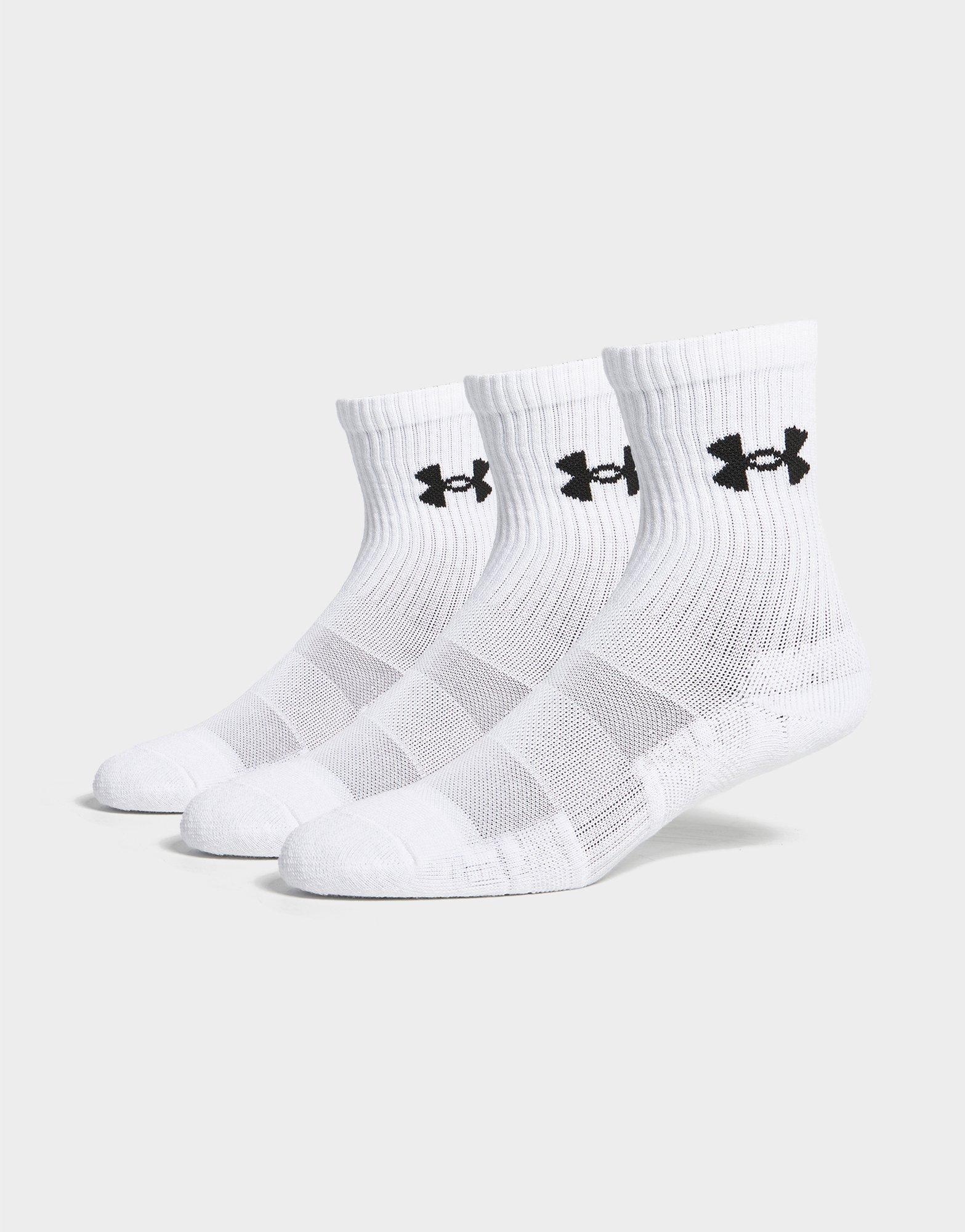 Step up your sock game with this Under Armour Performance Crew Socks 3-Pack, essential for any athlete's kit. Standard fit design provides all-day comfort whether you're training, running, or just on the move. White colourway with black detailing pairs seamlessly with any sneaker rotation. Engineered with moisture-wicking technology and arch support for enhanced performance. Style Code: 6009685-100