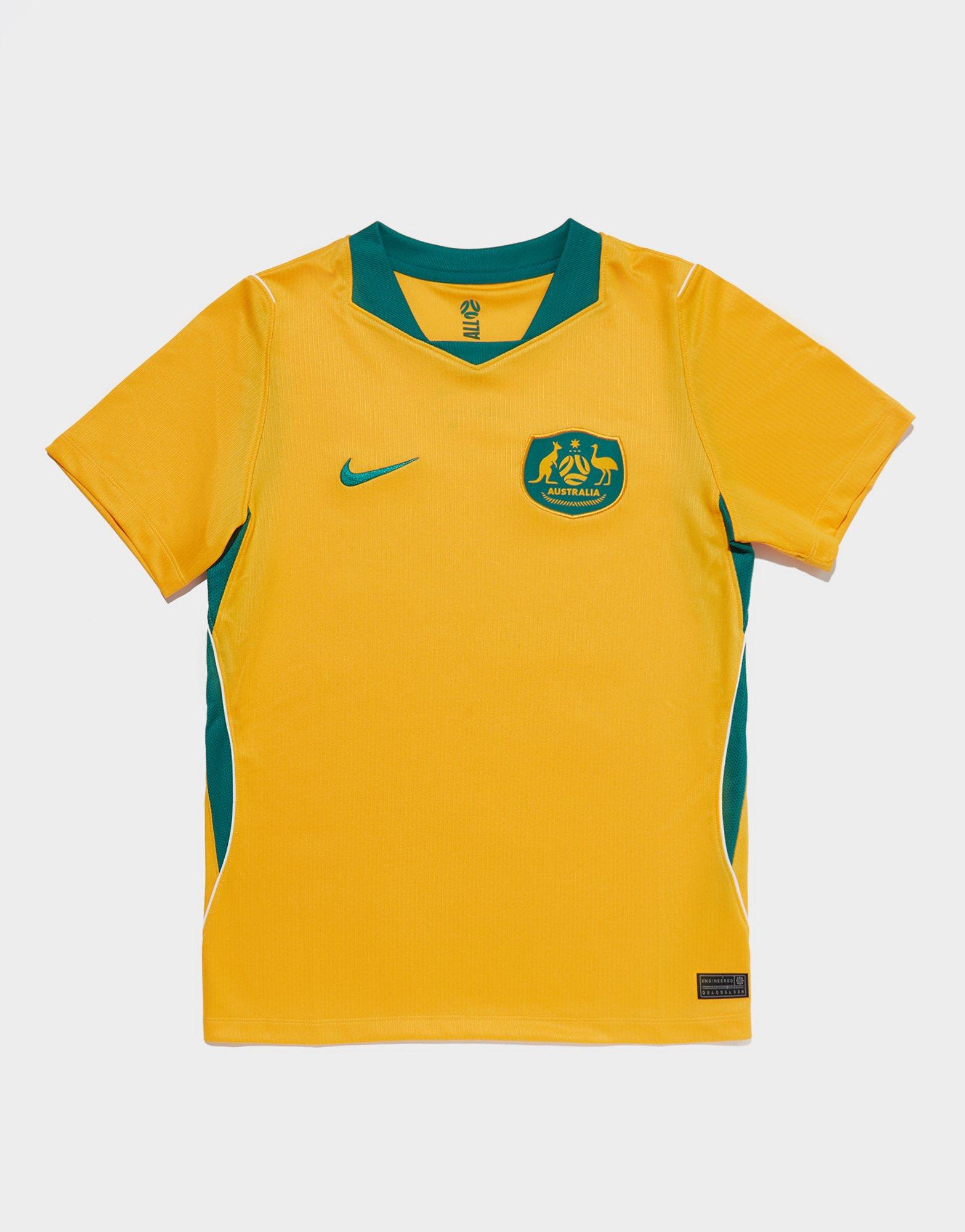 The junior Nike Australia Home Football Jersey in Yellow with Green brings the Socceroos' iconic national colours to young fans in an authentic match-ready kit. Built with lightweight Dri-FIT technology that wicks sweat away from the skin, it keeps young players cool and comfortable whether they are playing or cheering from the sidelines. The Yellow with Green colourway delivers the bold, unmistakable palette of the Australian national team, with Nike and Football Australia branding completing the authentic look. A must-have for young Socceroos fans looking to represent. Style Code: IB5083-704